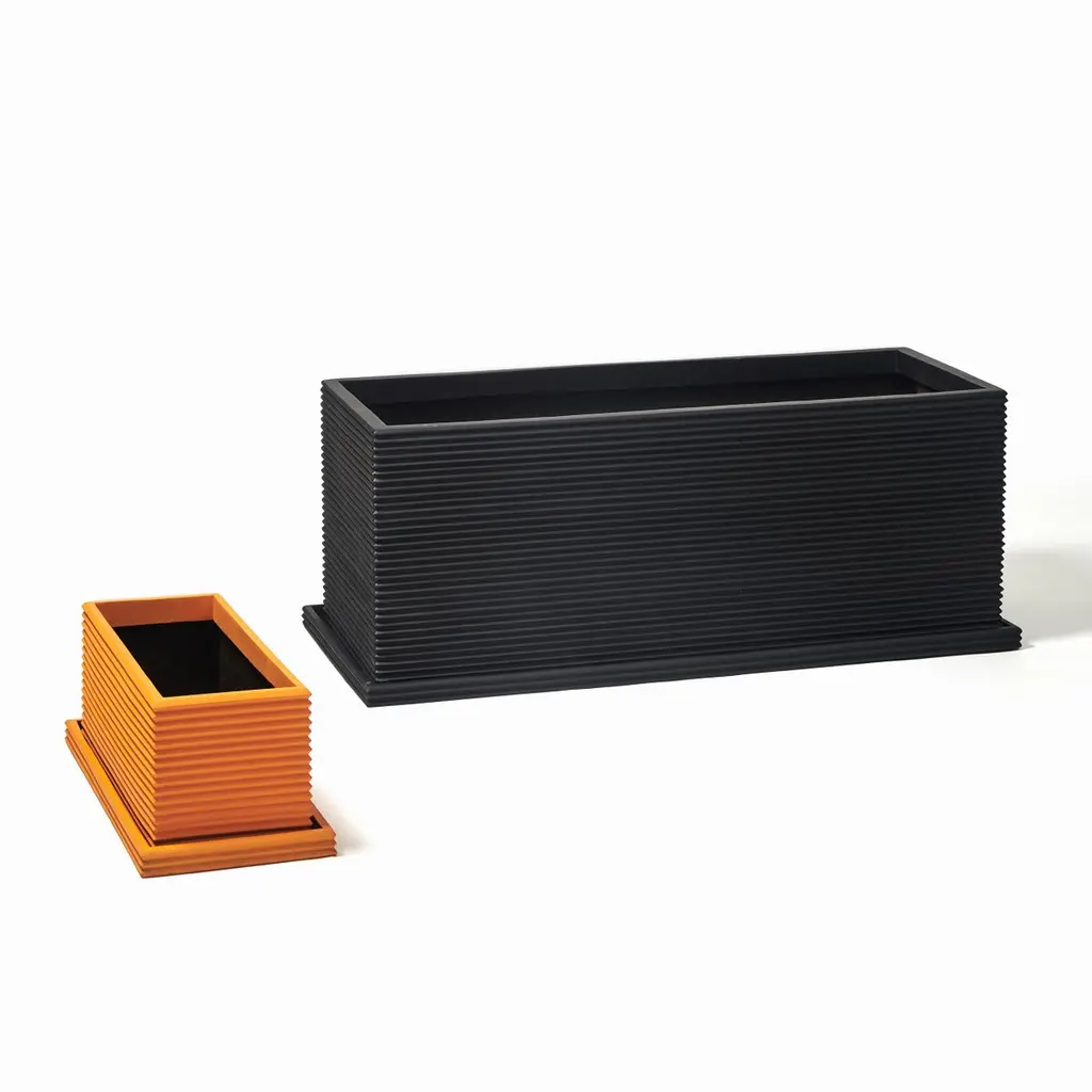 Standard Wide Rectangular Planter with Drainage TrayFiberglassHeight: 8"Width: 20"Length: 8" (not including tray)The standard wide rectangular planter is a classic shaped planter with fluted detail. All designs are hand crafted in Mexico and suitable for both indoor/outdoor use. Each planter contains drainage and comes with a matching fiberglass drainage tray. The collection comes in five colors and custom colors are available upon request.Item available for immediate delivery.Lead time for this item is 8-12 weeks.Please contact us for customization options.