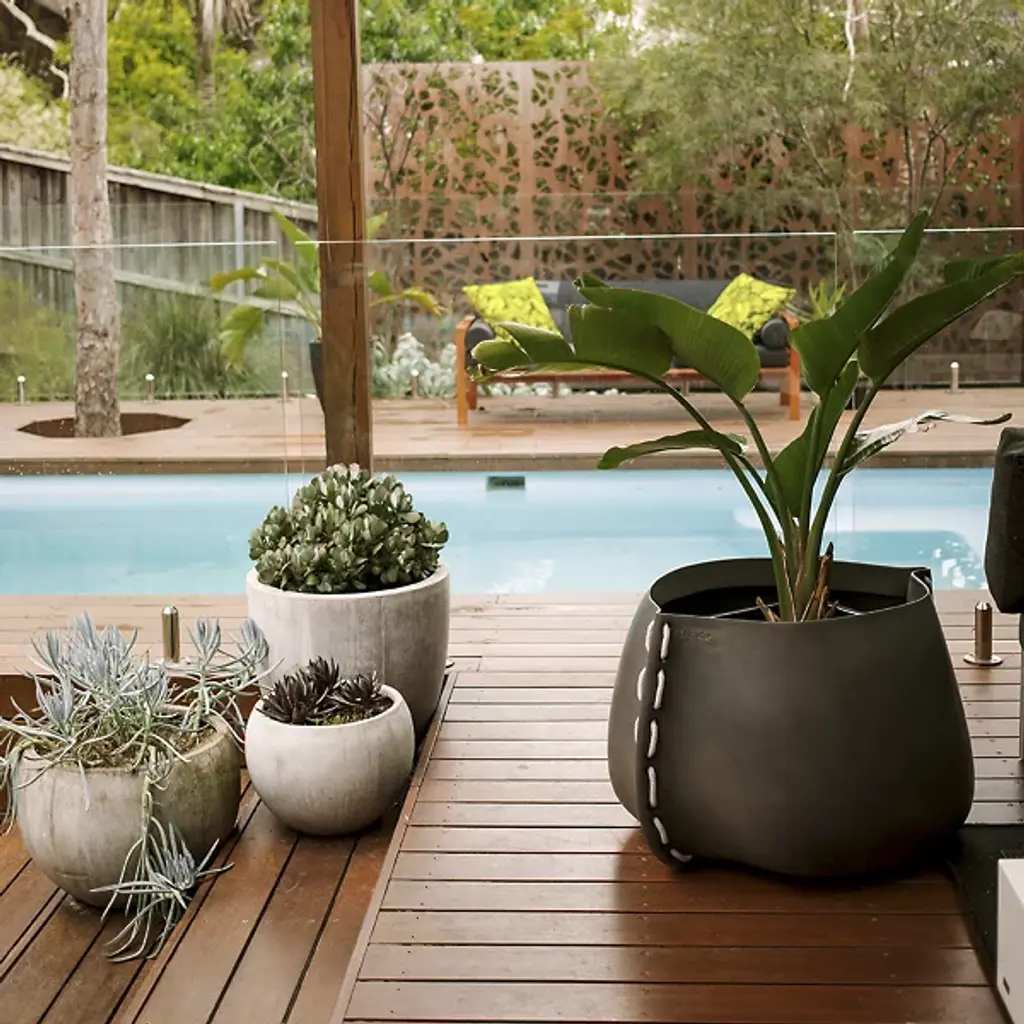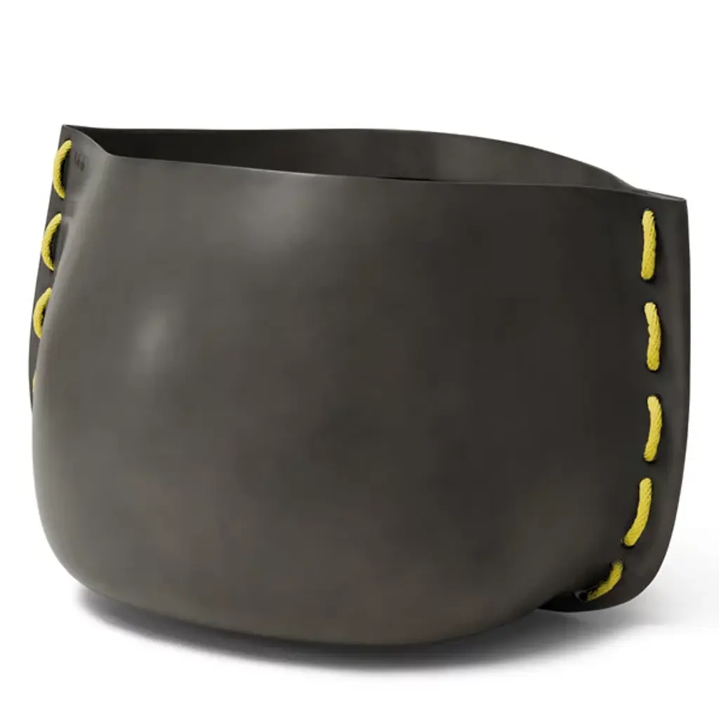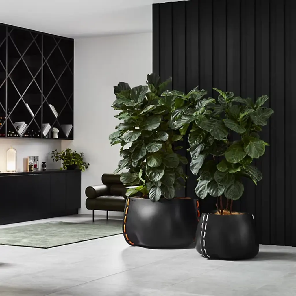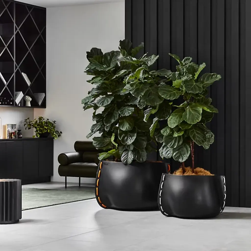 The Stitch 100 Outdoor Planter from Blinde Design features curved concrete walls adorned with decorative stitching details that mimic the appearance of sewn seams. This generous-scale planter transforms functional gardening into a sculptural statement through its organic bowl shape and contrasting linear embellishments. Its substantial capacity accommodates larger plants while the curved walls soften the material's inherent hardness. The piece works individually as a garden accent or clusters with additional planters for expanded growing arrangements. Both fresh and artificial plantings find suitable homes within its roomy interior.