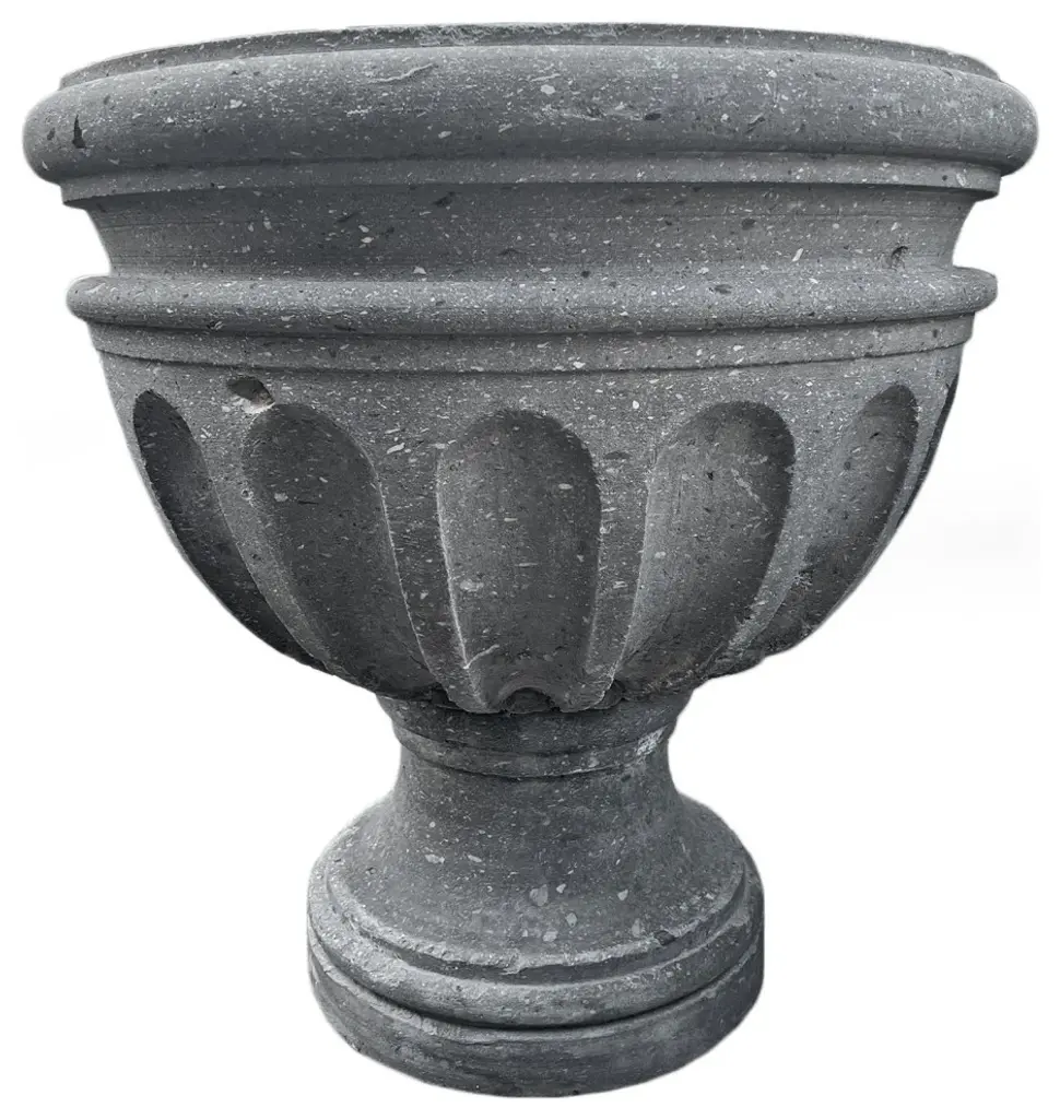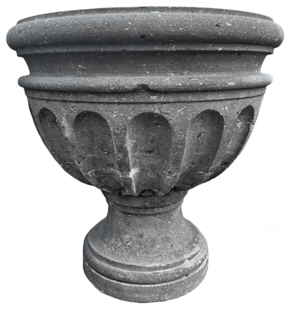 Grey stone cement mixture carved urn planter. Traditional Euro style large basin bowl which lifts off pedestal base.