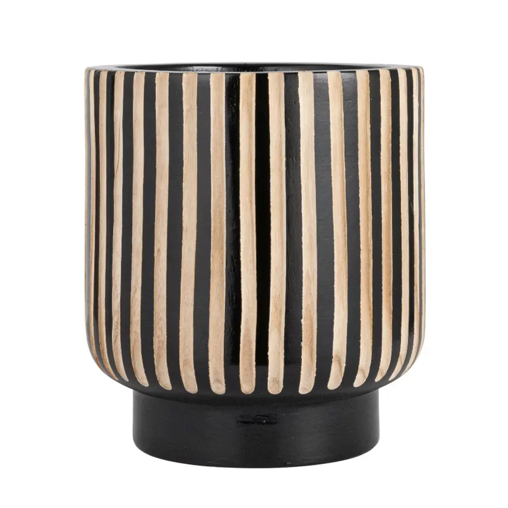 Elevate your indoor greenery with this Hand-Carved Wood Planter featuring striking vertical stripes and a sleek black finish. Crafted from durable wood, this planter boasts a modern yet artisanal design, perfect for showcasing your favorite plants. The natural wood accents beautifully contrast against the black backdrop, adding depth and texture to your décor. Ideal for tabletops, shelves, or any corner that needs a touch of nature and style, this planter seamlessly blends functionality with sophisticated design.