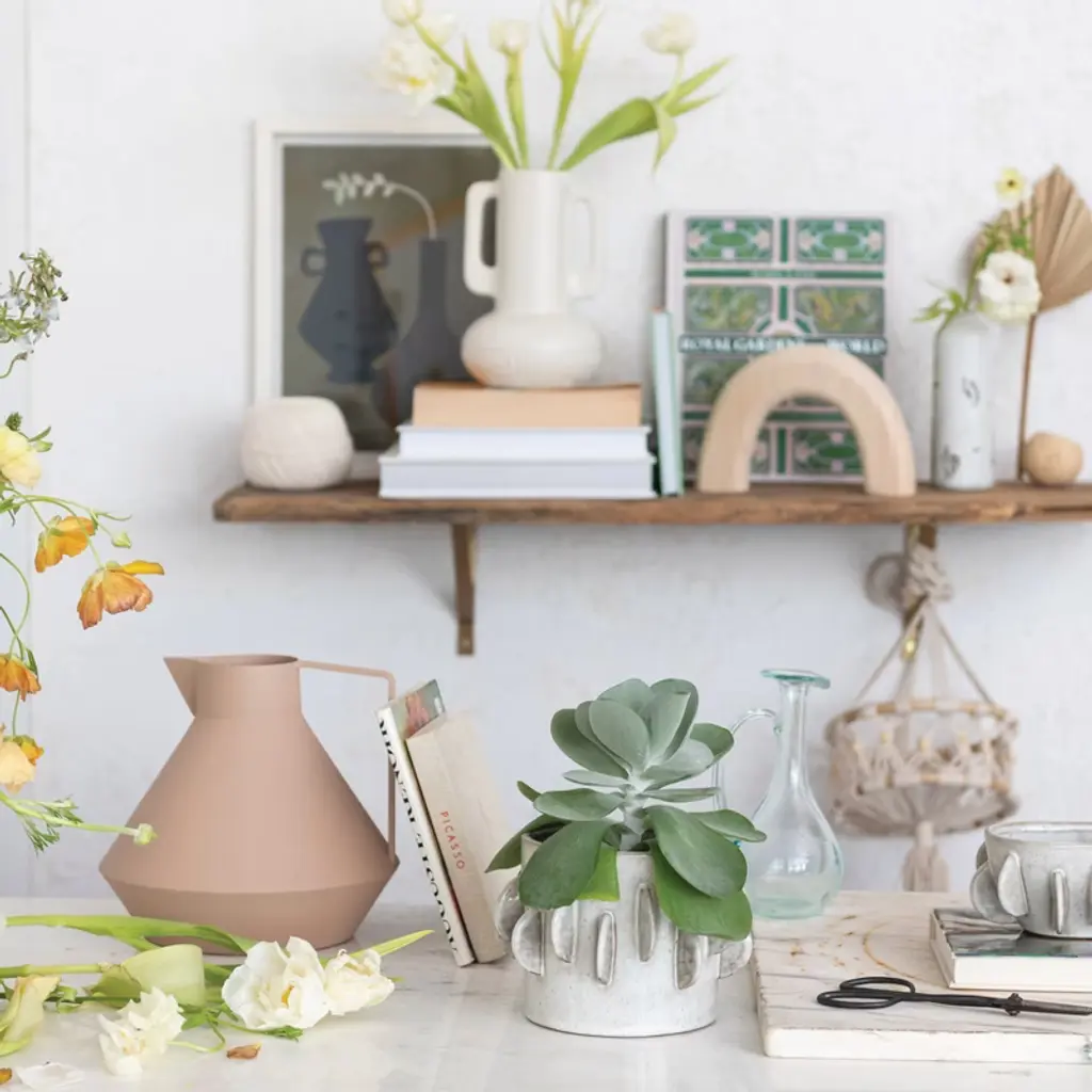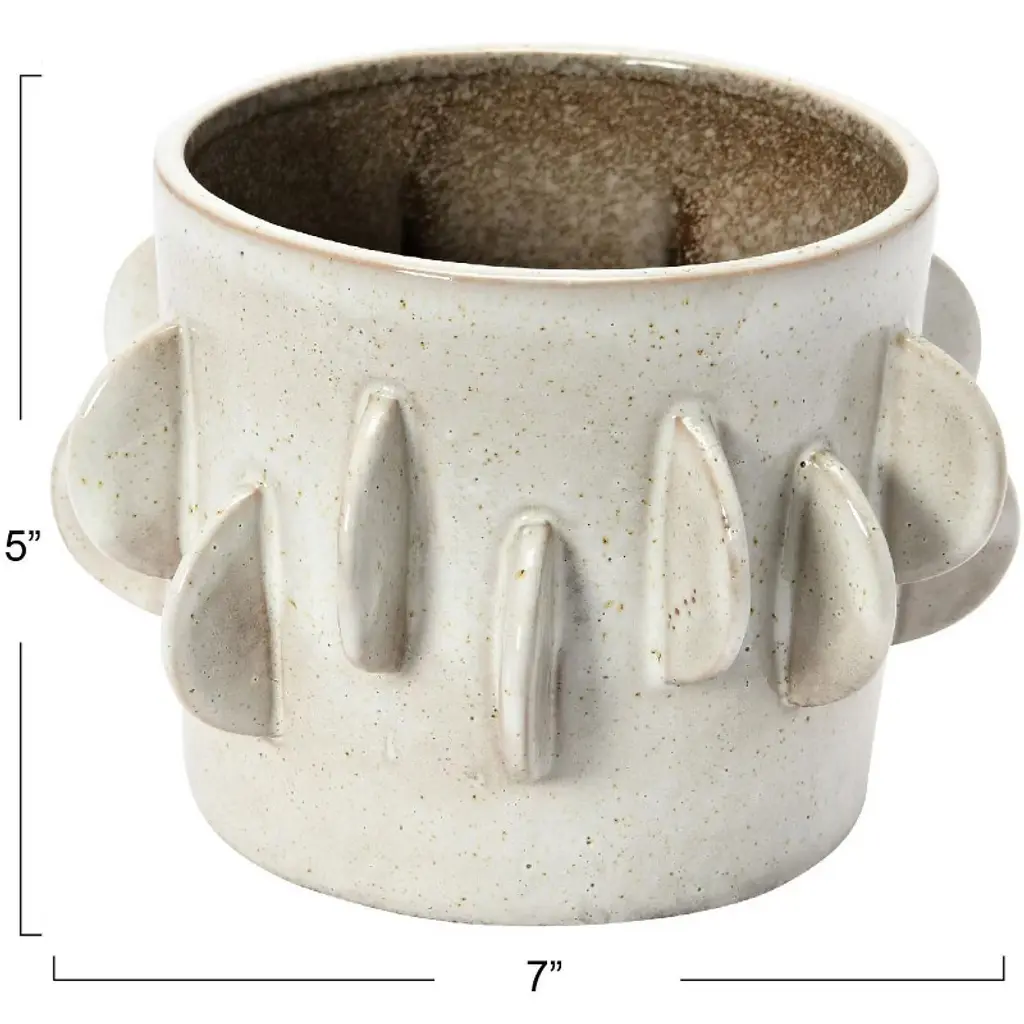 This Handmade Stoneware Planter with Reactive Glaze in Antique White makes the space more inviting and stylish. This planter is handmade from 100% stoneware material that is sturdy and durable. Its round shape and 3D accents give it a striking and modern look. The planter has a reactive glaze finish that creates a natural variation of antique white color, making each piece unique and beautiful. The planter has no drainage holes, so it is suitable for plants that do not require much water, such as succulents, cacti, or air plants. The planter measures 5.5 inches in diameter and 5 inches in height and can hold a 5-inch pot. Whether placed on the shelf, table, windowsill, or patio, this planter adds texture and elegance to the space with its handmade charm.