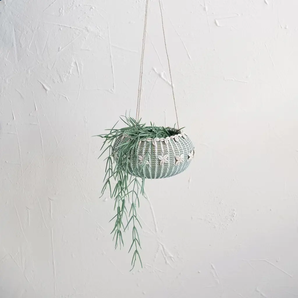 Storied Home Hanging Handwoven Rattan Planter With Shells And Jute Hanger, Aqua