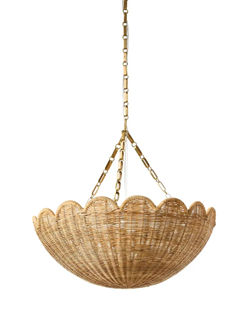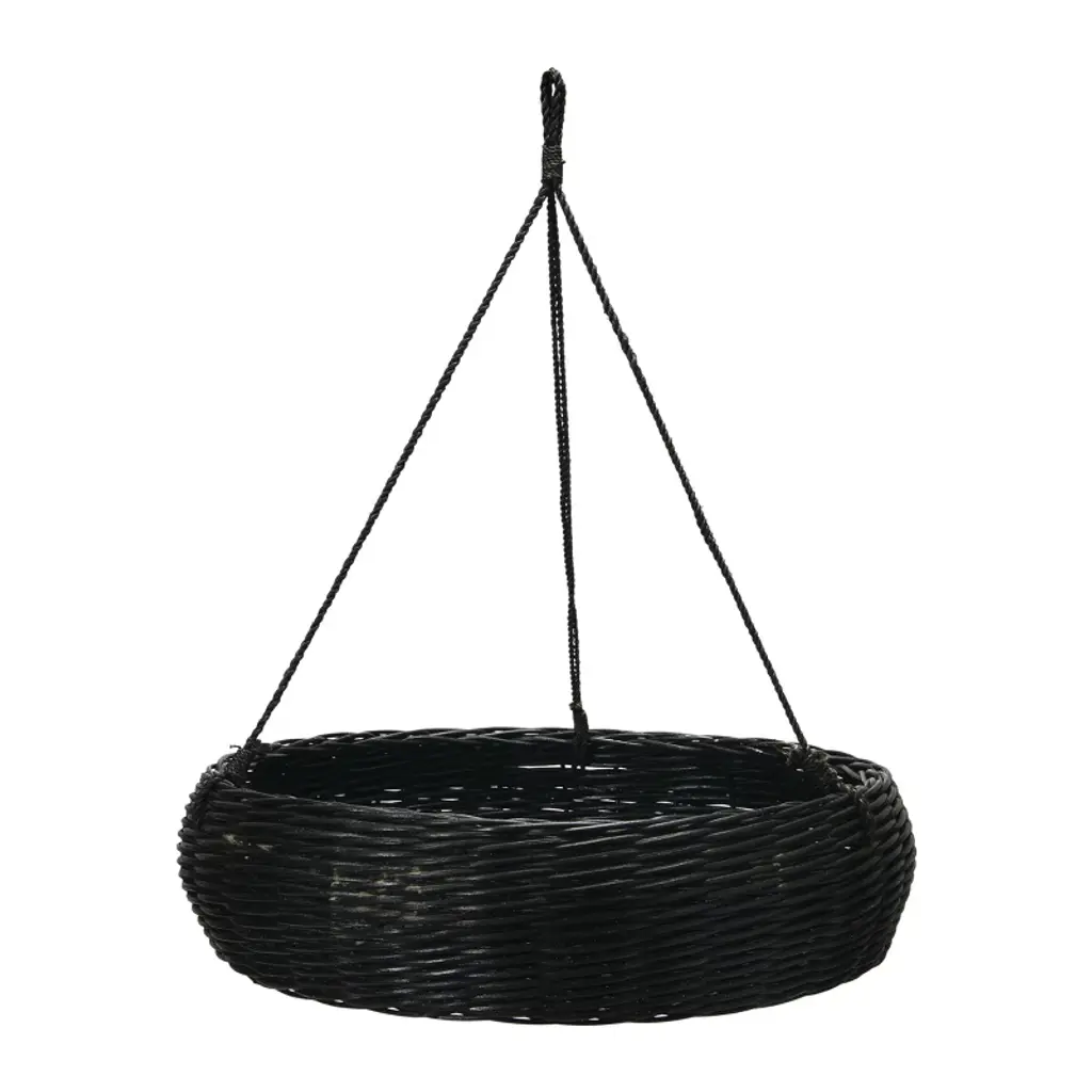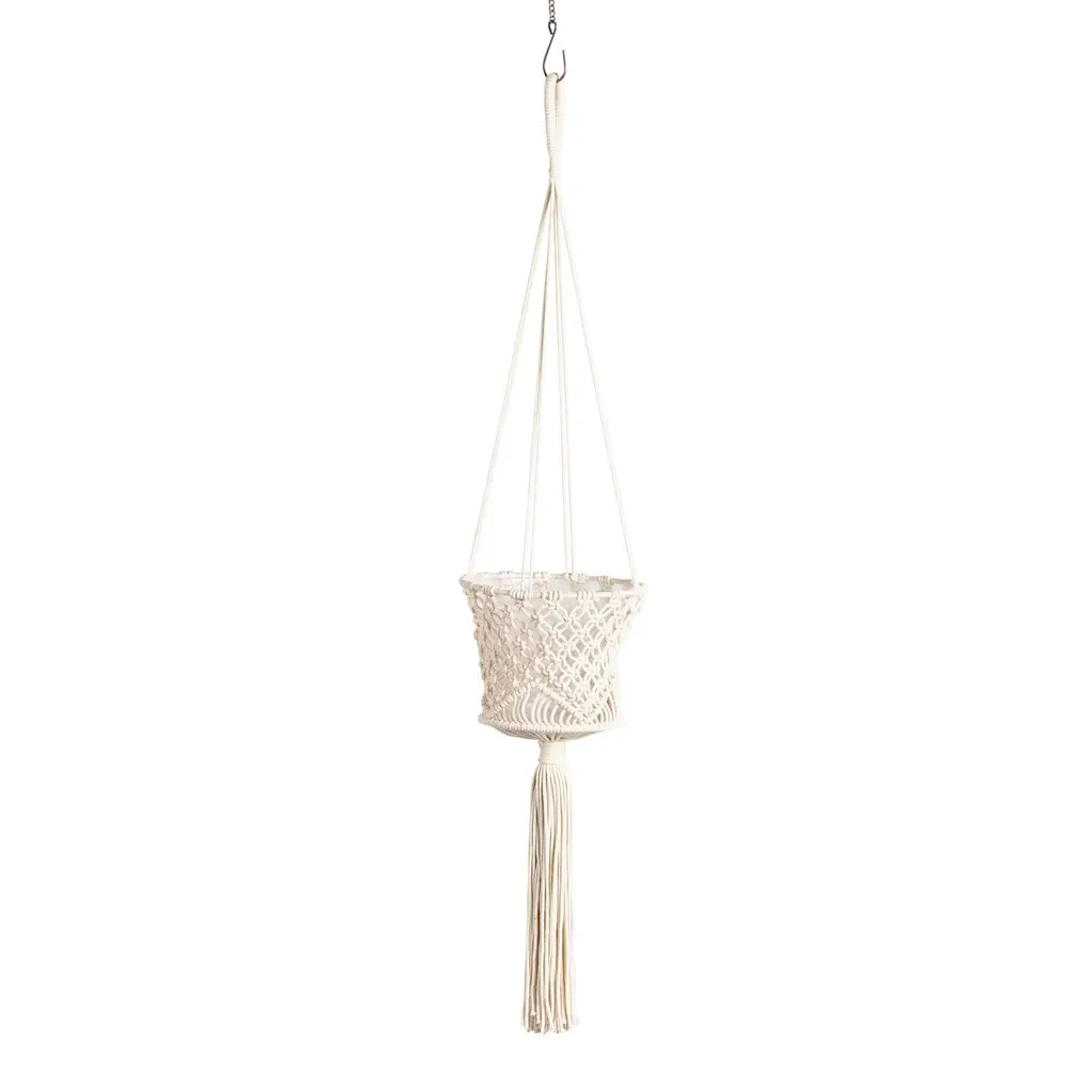 This minimalist rattan planter showcases an intricately handwoven rattan construction adorned with shells suspended from a jute hanger; 60% Rattan, 20% Synthetic Rope, 10% Shells, 10% Agel Rope; 10" L x 10" W x 6" H