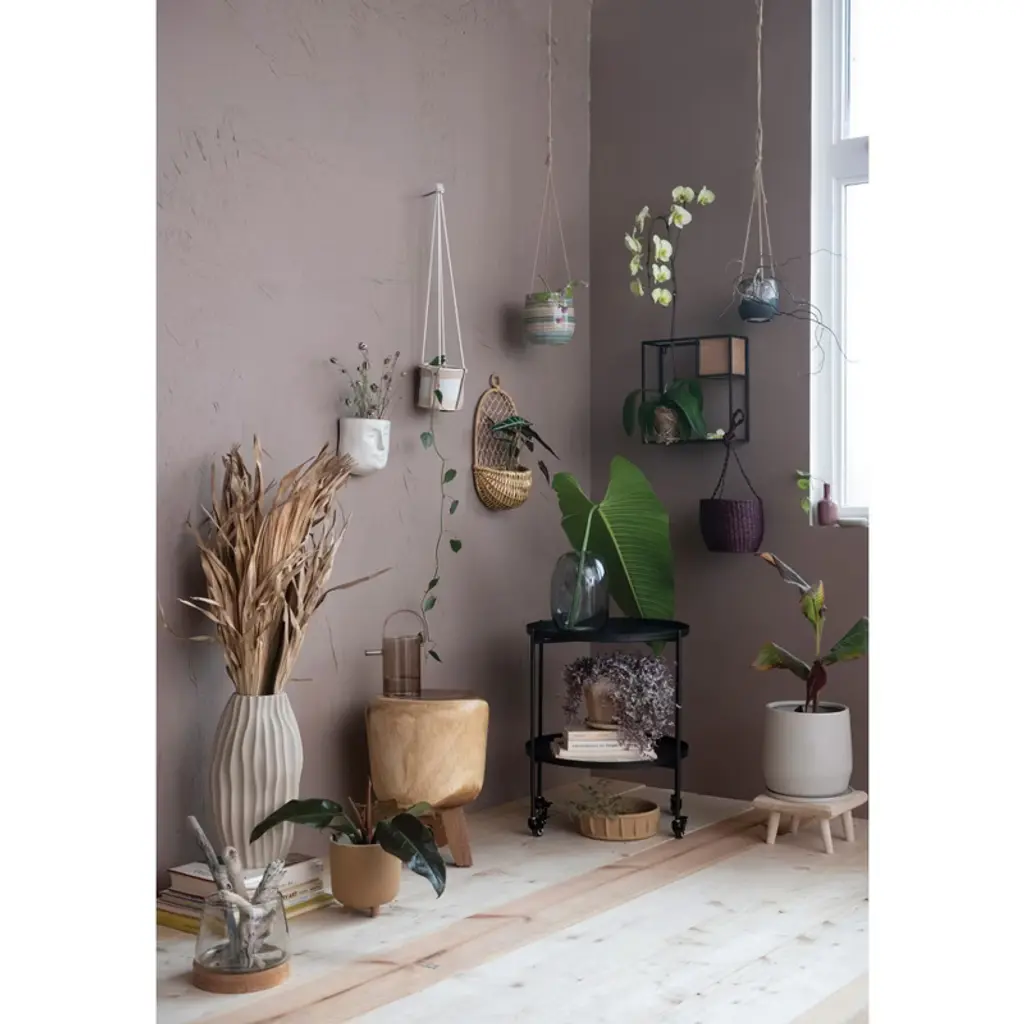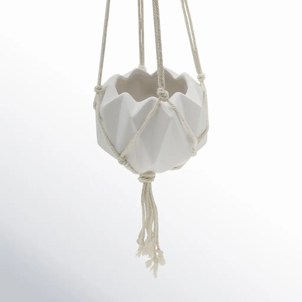 Add a dash of boho charm to any living space with this stylishly versatile hanging planter; Made from stoneware, vegan leather, and cotton; Planter measures 6" L x 6" W x 5" H
