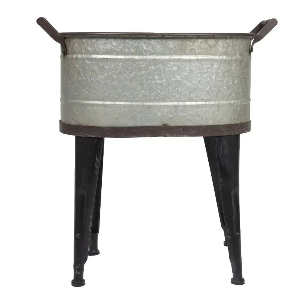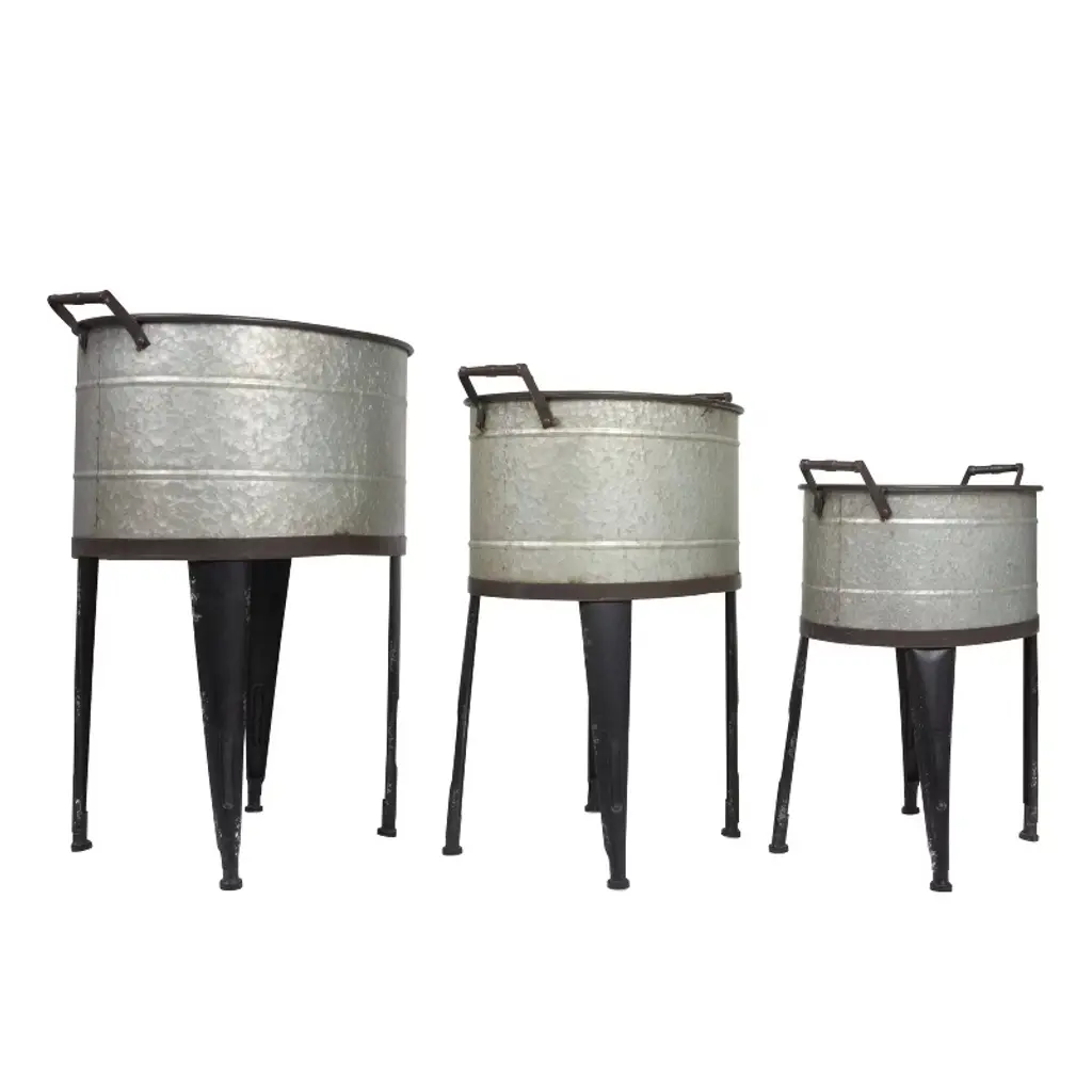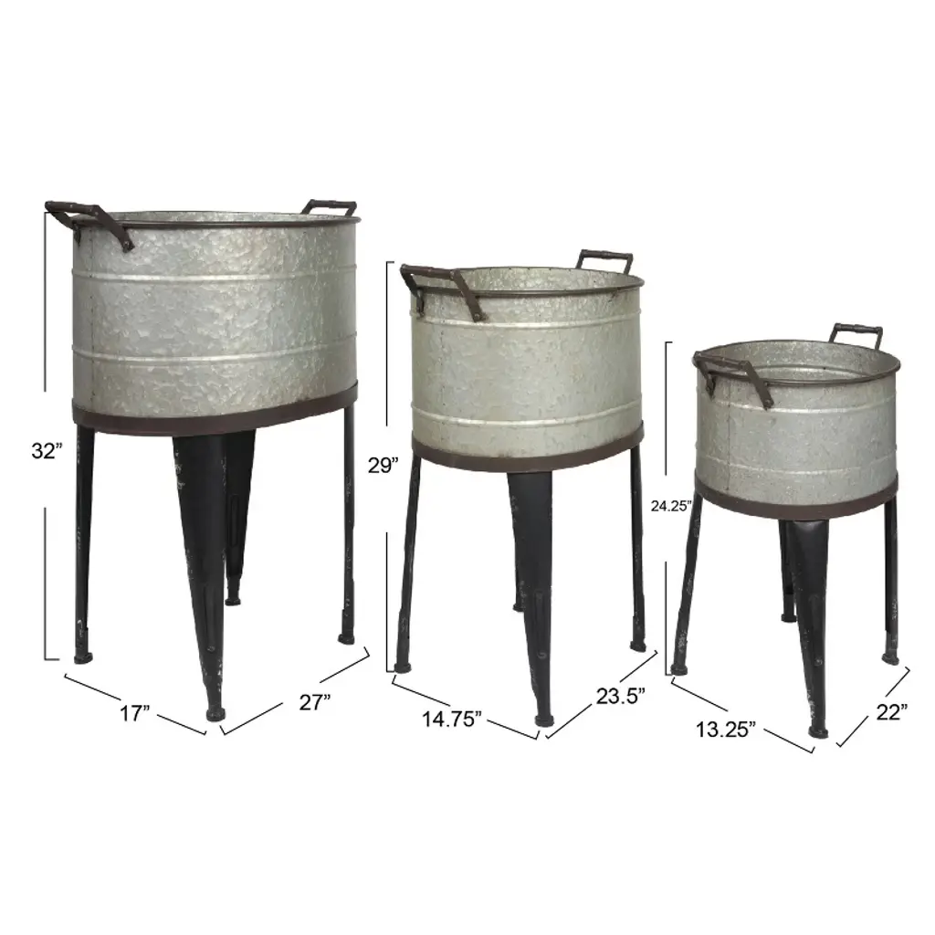 This set of three distressed silver and black metal planter pots with stands and handles adds character and style to any home or garden. These metal planter pots are designed to look like old-fashioned buckets with four-leg stands and a handle that makes them easy to move around. The metal surface has a distressed silver and black finish that gives them a rustic and antique appeal. These planter pots are perfect for displaying plants, flowers, herbs, or succulents in any indoor or outdoor setting. They have a spacious design that can fit a variety of plants, from small to large. They come in three different sizes to suit different needs: small, medium, and large. The small planter pot has inside dimensions of 17.5 inches long, 12.5 inches wide, and 8.25 inches high. The medium planter pot has inside dimensions of 19.5 inches long, 14 inches wide, and 10.25 inches high. The large planter pot has inside dimensions of 22.25 inches long, 16 inches wide, and 11.75 inches high. The planter does not separate from the stand, so the complete look of these beautiful metal planter pots with stands and handles can be enjoyed.