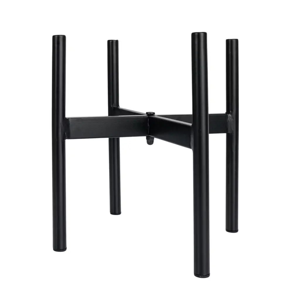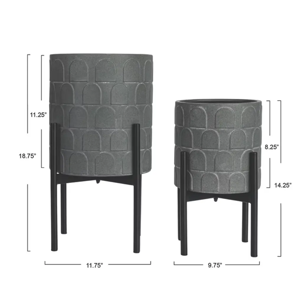 This set of 2 grey metal planters on stand are a stylish and functional addition to the home. These feature a round metal planter with an embossed modern-arch repeat pattern and matte grey finish. Each planter is supported by a black metal stand. These are ideal for placing potted plants such as fiddle leaf figs, money plants, and ferns. This set of 2 planters is a unique and versatile addition to any space, enhancing the aesthetic appeal of the kitchen, living room, or patio.