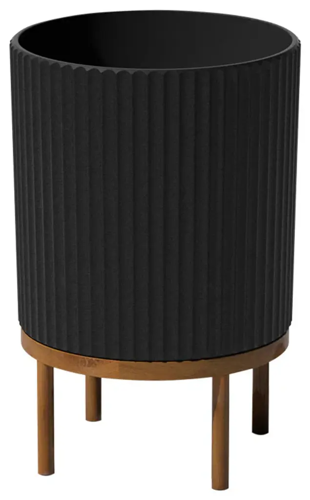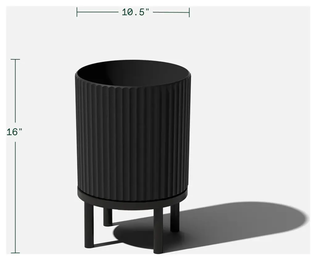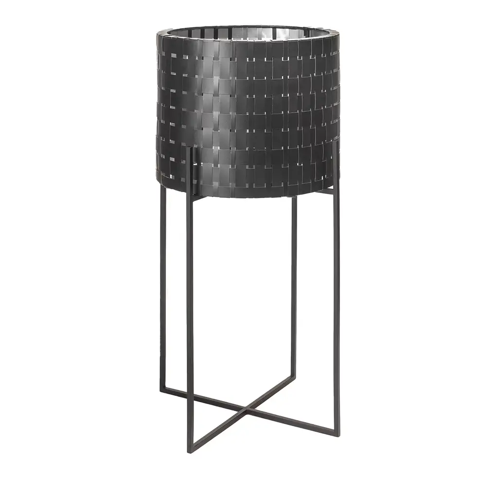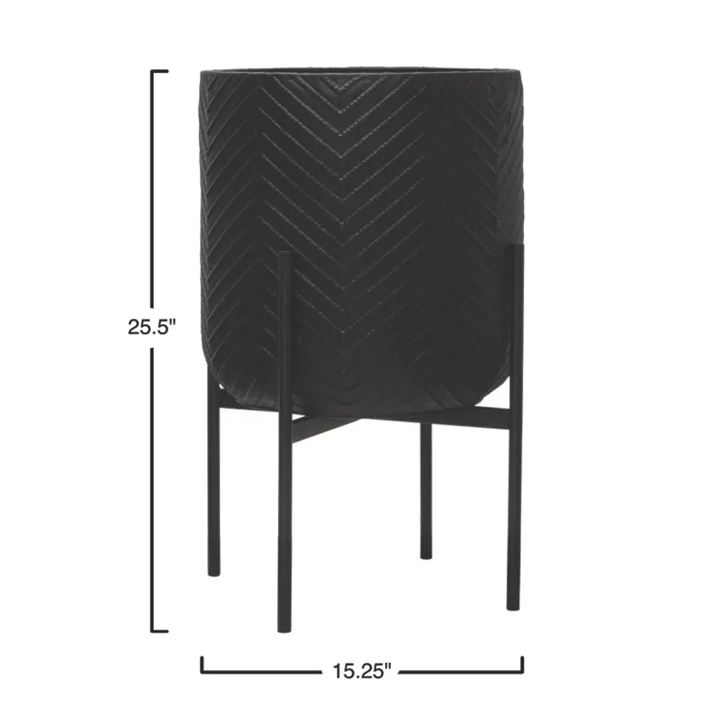 Give plants a chic and sophisticated home with this metal planter with a chevron pattern and stand. This metal planter features a modern chevron relief pattern that adds texture and dimension to the space. The planter has a matte black finish that matches any home decor and plant type, such as cactus, snake plants, and more. The planter is made of durable metal material that withstands different weather conditions. The metal planter comes with a sturdy stand that elevates the plants and creates a stunning display. The planter has no drainage holes so a plastic liner or potted plant is suggested. The planters measure 15.25 inches in diameter and 25.5 inches in height. Whether in the living room, bedroom, balcony, or patio, this planter on stand will bring style and charm to the space.