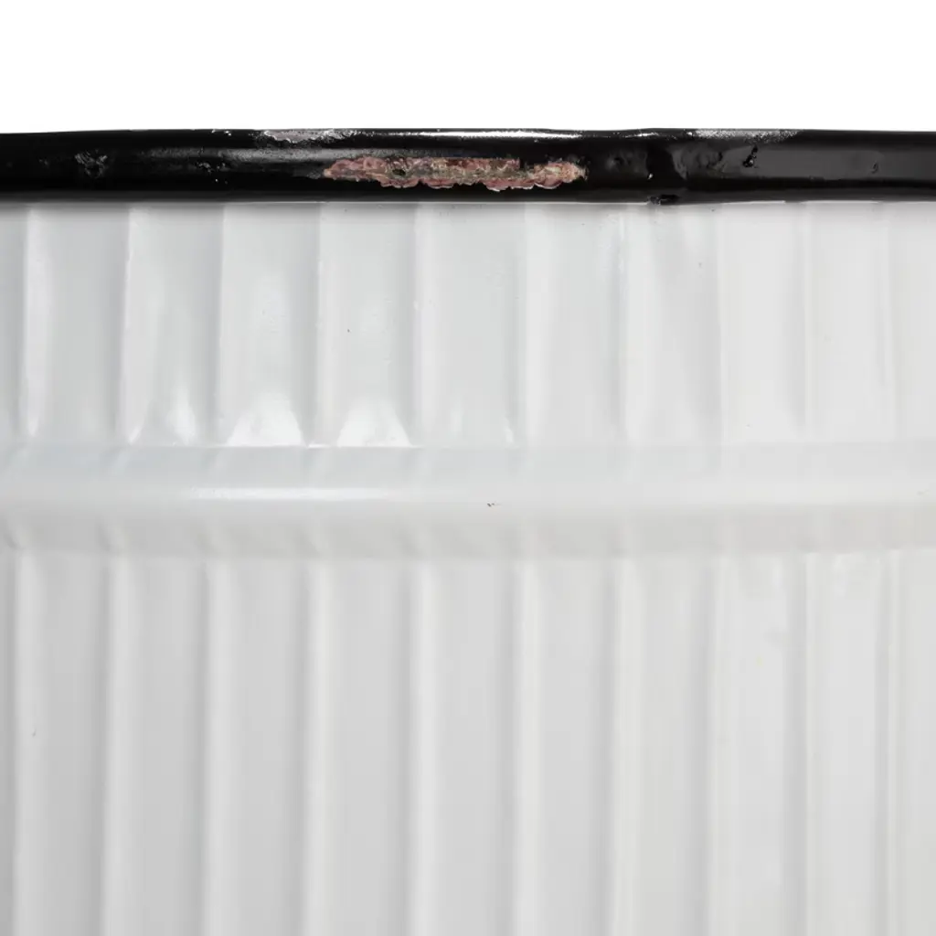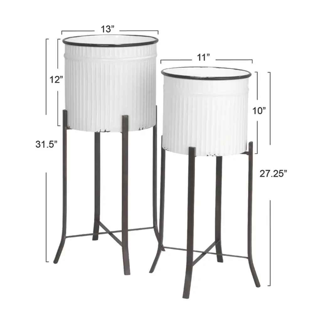 This set of two white and black round metal planters on stands adds style and convenience to any home or garden. These metal planters are designed to appear like round buckets with an antique enameled surface that gives them a unique farmhouse appeal. Designed without drain holes, these planters are perfect for holding 10-inch and 12-inch diameter pots. The planters include stands to provide stability and height to the plants, making them more visible and attractive. The planters have a white and black finish that gives them a sleek and elegant look. The finish also creates a contrast with the greenery of the plants, making them stand out and catch the eye. They can complement any color scheme and add some character and charm to the space. They come in two different sizes. The larger planter measures 13.25 inches in diameter and 30.25 inches in height, while the smaller planter measures 11.75 inches in diameter and 27 inches in height. These white and black round metal planters on stands are a stunning way to display and grow plants in style.
