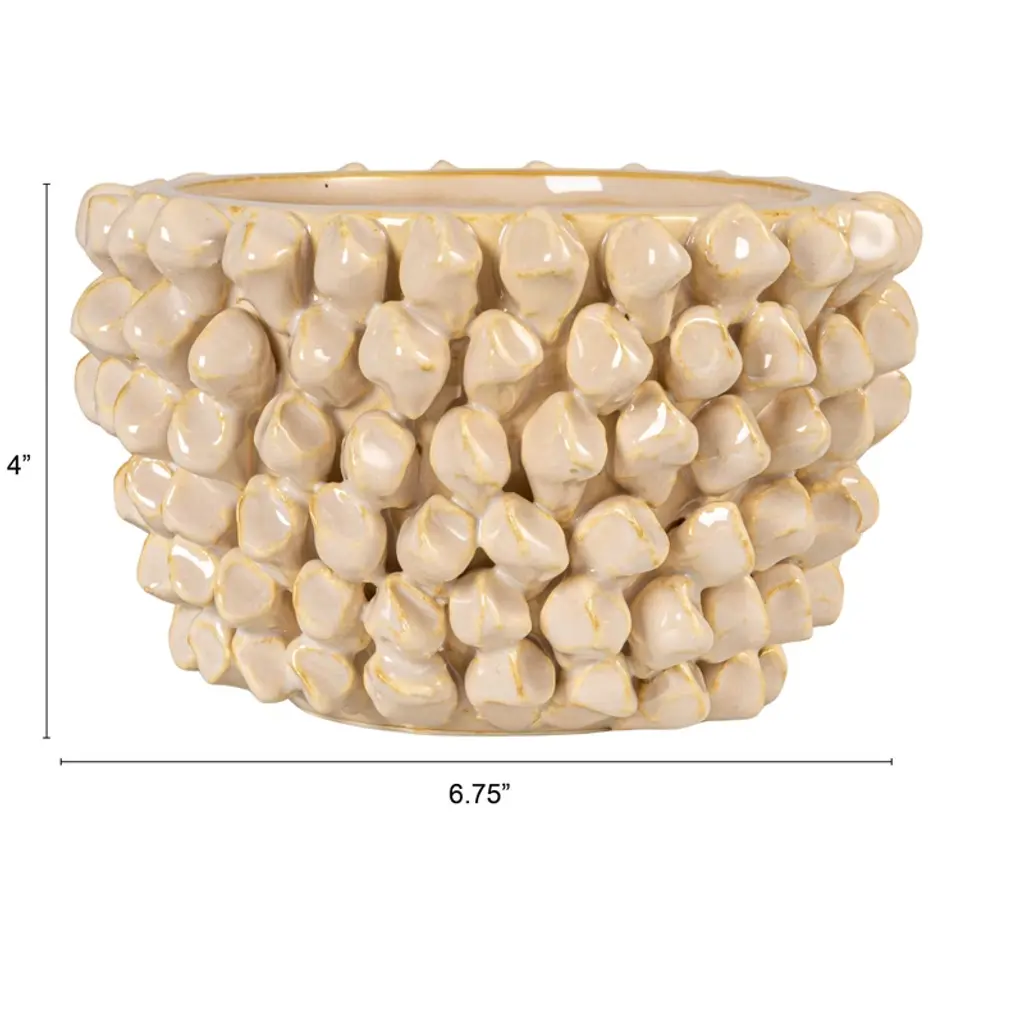 This Round Stoneware Planter features a unique 3D spiked design and a cream finish, making it a standout piece in any decor. Perfect for farmhouse, French country, transitional, and contemporary styles, this planter adds a touch of modern rustic charm to any space. Made of durable stoneware, it is both durable and easy to clean. Features a distinctive 3D spiked texture and a compact size ideal for small spaces. This planter measures 6.75 inches in diameter and 4 inches in height and holds a 5-inch pot, offering both beauty and functionality. The neutral cream finish allows for easy pairing with a variety of plant colors and textures, making it a versatile addition to any indoor or outdoor setting. Whether used to showcase vibrant flowers or lush greenery, this planter is sure to elevate the look of the home or garden.