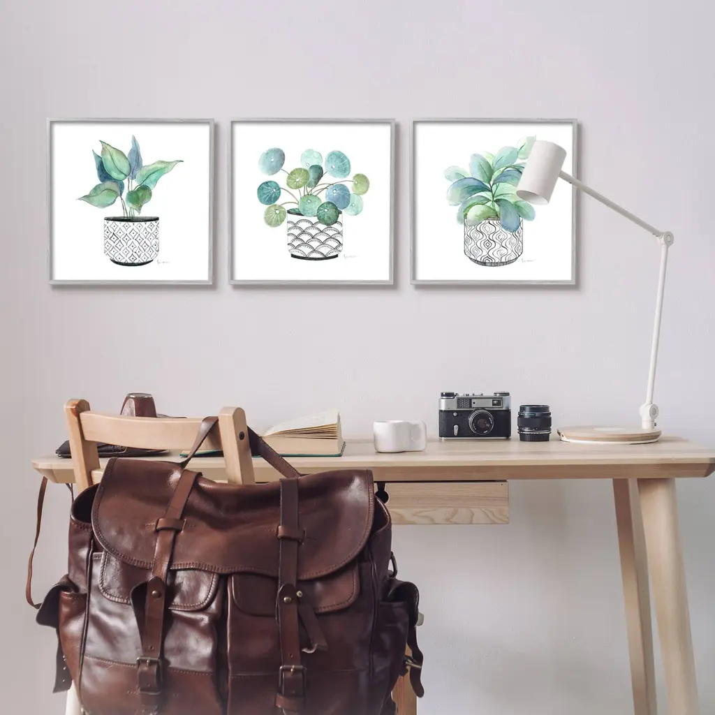 Stupell Patterned Planter Vase Lush Blooming Green Leaves 3 Piece Framed Wall Art, Design By Tava Studios - 17 X 17 - Grey