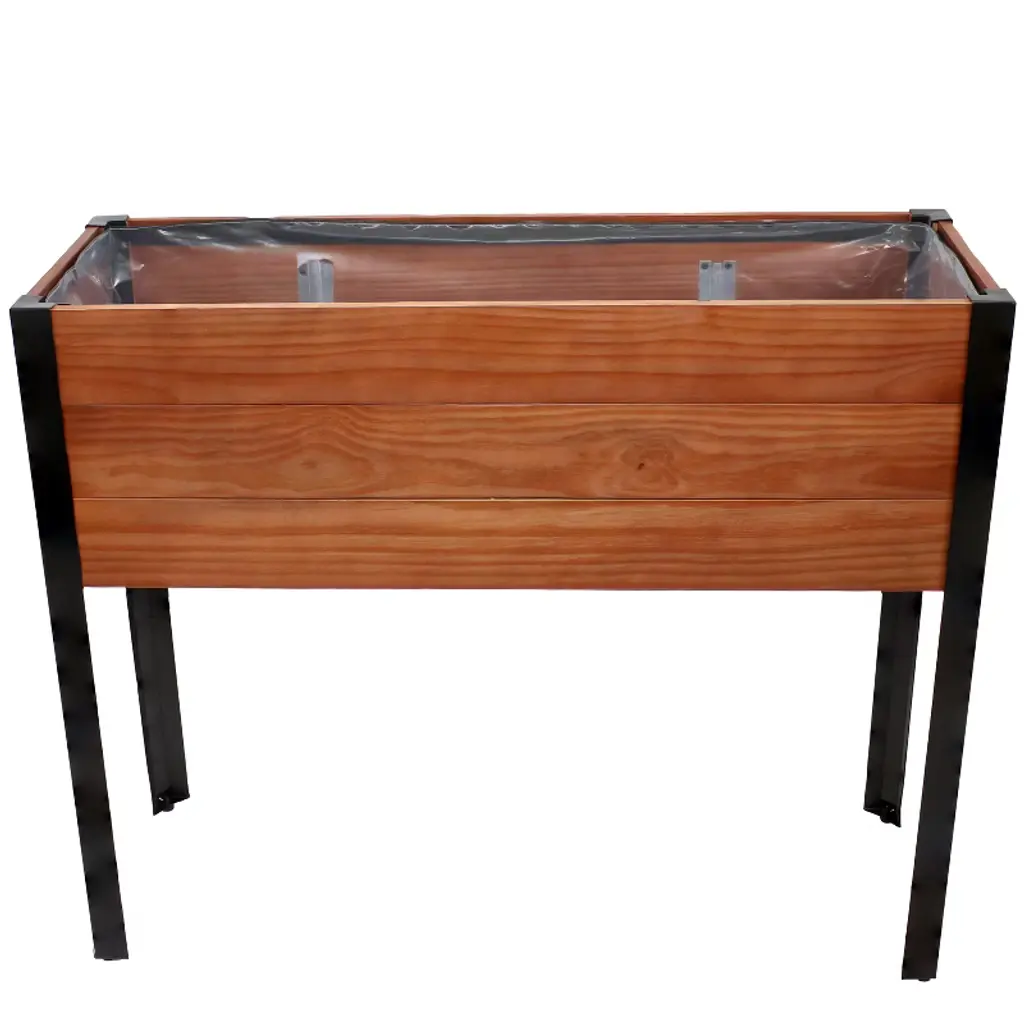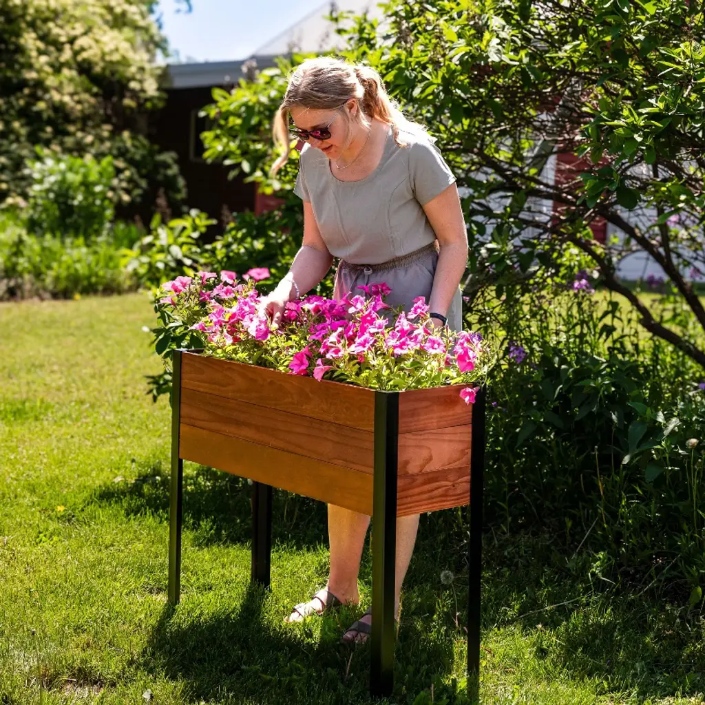 Gardening has never been easier on the back and knees with this beautiful, wooden raised vegetable garden bed. Standing 31 inches tall, this elevated planter box with legs makes it easy to access the plants growing inside without needing to stoop. Made from quality materials, this sturdy planter box is designed to withstand the outdoor elements. It features a powder-coated steel frame in classic black and a planter box made from acacia wood for a sophisticated, natural look that will complement any outdoor decor style. Choose between the brown or gray color options. This raised planter bed is a stylish addition for the patio, garden, deck, or front porch. Plus, this planter includes a convenient removable planter bag. Made from durable polyethylene, this bag easily attaches to the bottom of the planter box using fabric hook-and-loop fasteners. Attaching or removing the bag is simple for easy maintenance. This garden bed also has six built-in drainage holes for growing healthy plants, flowers, and vegetables.• EASILY ACCESS PLANTS: This elevated garden bed positions plants at the right height for convenient gardening with no stooping or squatting. The garden bed measures 36.75" W x 12.75" D x 31" H and weighs 23.2 lbs. The inner box measures 35.75" W x 11.5" D x 10.25" H. It has a soil capacity of 18.2 gal (2.43 cu ft) and a weight capacity of 45 lbs.• SOPHISTICATED INDUSTRIAL LOOK: The elevated outdoor planter box is constructed of stylish acacia wood with a sturdy powder-coated steel frame. The removable planter bag is made from durable polyethylene.• REMOVABLE PLANTER BAG: This raised flower bed on legs features a convenient, removable planter bag that can be used inside the planter box for easy maintenance. The bag is attached with 2 cm hook-and-loop fabric fasteners so it simple to attach or remove. Each bag features 6 drainage holes that measure 0.5" in diameter each.• BUILT FOR LASTING STRENGTH AND BEAUTY: This elegant raised vegetable planter is made to resist the outdoor elements. It makes a beautiful addition to the patio, backyard, or front porch.• WORRY-FREE PURCHASING: Sunnydaze Decor backs its products with a 1-year manufacturer's warranty.