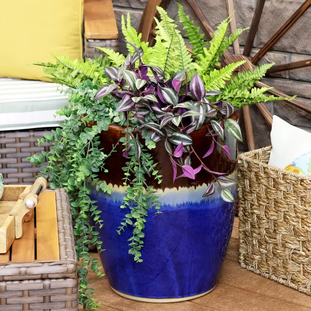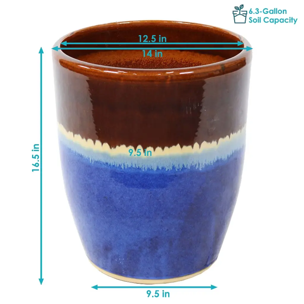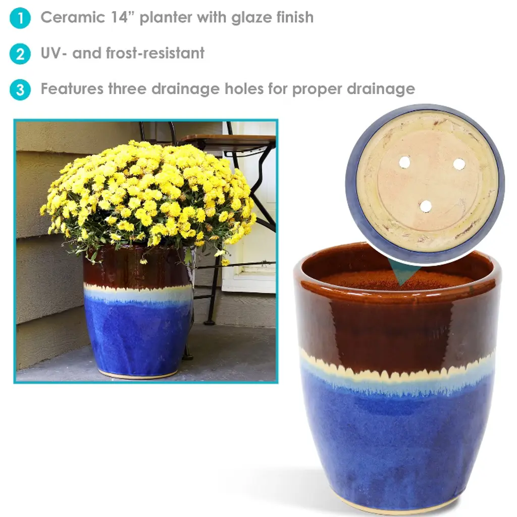 Brighten any indoor or outdoor space with some natural beauty and life. This ceramic flowerpot can be used as a decoration on the porch, patio, yard, or living room. Fill the Captivating Vista ceramic planter with vibrant greenery, fragrant flowers, and other beautiful plants to breathe life into any indoor or outdoor area. Set the planter on a stand (not included) in the living room or kitchen, or place it on the porch or front step. This beautiful large indoor planter is made from durable ceramic clay with a mineral glaze finish for added resistance to the elements and long-lasting beauty. This large round flowerpot features 3 holes in the bottom to allow proper drainage for flowers, herbs, greenery, and plants. Be sure to always use a saucer (saucer not included) beneath the planter when placing it indoors to avoid spilling excess water and soil on the floor.• LARGE CERAMIC PLANTER: This decorative planter for indoor plants is a great size for growing flowers, greenery, or herbs. This 14" plant pot measures 12.5" inner top diameter (14" outer top diameter) x 9" inner bottom diameter (9.5" outer bottom diameter) x 16" H (inner) (16.5" outer) and weighs 30 lbs. It can hold up to 6.3 gallons/0.85 cubic feet/812 ounces of soil. The planter features (3) 1" drainage holes to allow excess water to run out.• DESIGNED TO LAST: This round outdoor 14-inch plant pot is made from durable ceramic with a mineral glaze finish to withstand the elements and maintain a beautiful appearance. Please note, variations in color may occur due to manual glazing and the unique kiln firing process.• USE INDOORS OR OUTDOORS: This large planter pot is designed to be used both indoors and outdoors. Set it on your porch, front step, patio, or landscaping to add a colorful accent to your outdoor spaces, or place it in your kitchen, living room, or sunroom to add natural beauty inside your home.• FLOWERPOT WITH DRAINAGE: This outdoor planter features three 1" diameter drainage holes at the bottom to allow proper drainage while watering your plants. If using this flowerpot indoors, a saucer is required beneath the planter to prevent water from leaking on the floor (saucer not included).• WORRY-FREE PURCHASING: Sunnydaze Decor backs its products with a 1-year manufacturer's warranty.