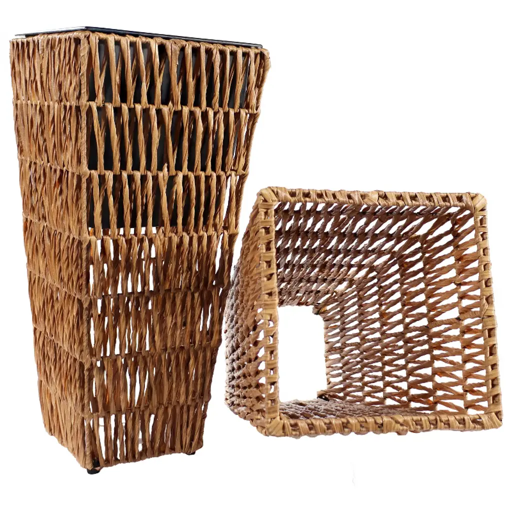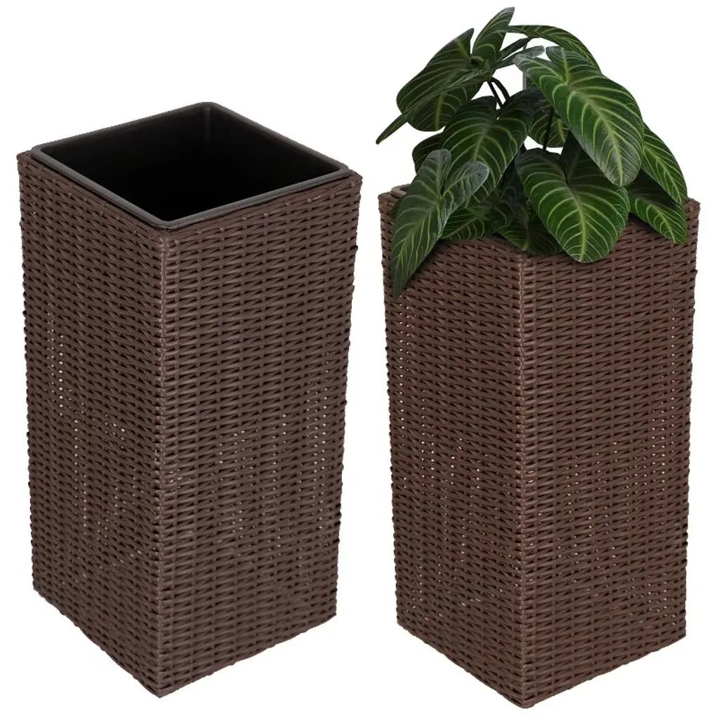 Decorate the patio, front step, porch, deck, living room, or sunroom with fresh greenery or flowers with these tall planters. The planters are made with an aluminum frame and a durable polyethylene wicker exterior. Poly-wicker is weather resistant and won't crack or splinter from overexposure. The wicker look adds a traditional touch to any living space. The tall planters with insert are designed to be used both indoors and outdoors. Never worry about soil or water leaking from the planter with the drainage hole-free polypropylene liner inside the planter. The liner also keeps roots neatly contained as plants grow to avoid any growth from forming around the wicker exterior of the planter. Because the planter does not have drainage holes, water the plants carefully to prevent overwatering and consider placing them in a location that receives little rainfall. Each planter has self-leveling feet on the bottom to ensure stability on any flat surface. These large square planters do not require any assembly; just pull them out of the box and fill them with soil to begin growing flowers or plants!• TALL AND STYLISH DESIGN: Each poly-wicker planter in this set measures 11" W x 11" D x 24" H overall and weighs 4.2 lbs. The planter area (inside the liner) measures 9.25" W x 9.25" D x 9.75" H. Each planter has a soil capacity of 3.6 gallons/0.48 cubic feet/462 ounces.• NATURAL WICKER LOOK: These planters are made from polyethylene faux wicker to last for years. Poly-wicker is resistant to the elements, easy to clean, and won't splinter unlike natural wicker. The wicker-like design adds a traditional touch to any living space. Each planter has an aluminum frame to keep the planter's shape and a polypropylene liner to contain the soil within the planter.• CREATE A COHESIVE LOOK: Use these 2 tall wicker planters to create a cohesive, symmetrical look outdoors on the patio, porch, deck, or walkway. These planters are also designed to be used indoors in the living room, hallway, or sunroom. There's no need to worry about water leaking from the planter because they are designed without drainage holes.• CONVENIENT DESIGN: Each poly-wicker planter in this set comes with a polypropylene liner that can be removed to make cleaning easy. The liner insert keeps roots and soil neatly in the planter and prevents the faux wicker exterior from getting entangled with plants. Each planter also features self-leveling feet to ensure the planter is stable on any surface.• WORRY-FREE PURCHASING: Sunnydaze Decor backs its products with a 1-year manufacturer's warranty.