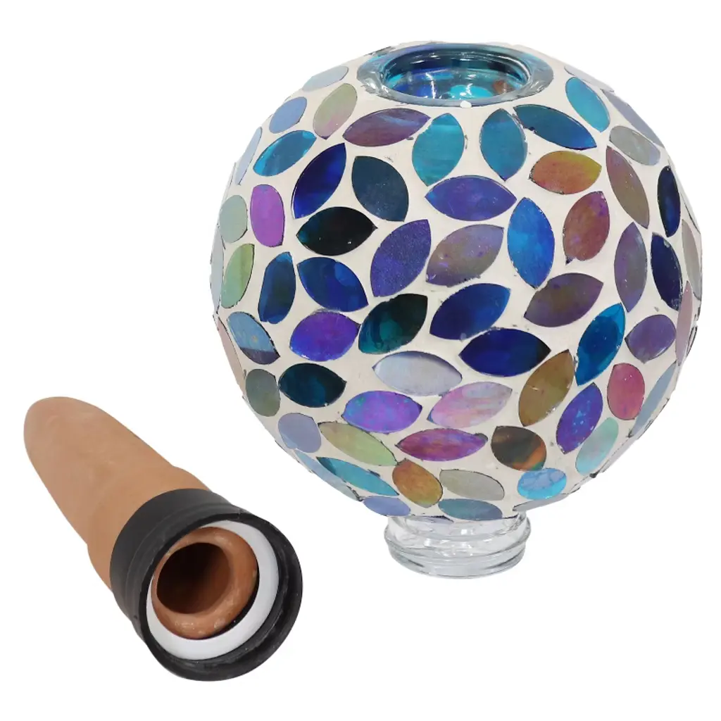 Keep plants healthy and hydrated with this elegant glass watering globe featuring a ceramic spike for consistent moisture delivery. The self-watering design automatically releases water to the roots as needed, helping prevent overwatering while promoting strong root development and healthy growth. With a 15-ounce capacity, it provides ongoing hydration—great for minimizing daily plant care and supporting plants while away. The vibrant mosaic glass globe adds a decorative accent to any setting, while the ceramic spike ensures efficient water release. Its two-piece construction makes assembly simple, and the wide 1" top opening allows for quick, easy refills without mess. Suitable for use in hanging baskets, patio containers, windowsill pots, or desk planters, this watering globe adapts effortlessly to both indoor and outdoor environments. Whether placed in a sunny kitchen window or a shaded porch corner, this watering globe delivers consistent moisture while enhancing any plant display.• VACATION-READY PLANT CARE: Get away from home without worry of plants wilting with this plant watering globe. The bulb holds up to 15 ounces of water to keep plants healthy and hydrated for days without manual watering. The watering globe measures 5" in diameter x 9.5" H overall and weighs 0.8 lbs. The globe sphere measures 5" diameter x 5" H, while the clay stem measures 1.5" diameter x 5.5" H. There is a 1" diameter opening at the top of the globe to make adding water easy. • ELEGANT AND FUNCTIONAL DESIGN: The hand-crafted mosaic glass globe adds a pop of color while supporting root growth through a practical self-watering system. The self-watering stake is made from terracotta ceramic and slowly releases water only when the soil needs it, maintaining consistent hydration and preventing overwatering. Stick this plant waterer in any planter to add a bit of sparkle to flowers and greenery.• EASY TO USE: This flower watering bulb for indoor plants requires little effort to help keep plants properly hydrated. It assembles in 2 pieces for immediate use. Simply twist the spike onto the globe, press the stake into the soil, and fill the sphere with water. Gravity takes care of the rest! To ensure even watering, push the stem fully into the soil; only the mosaic glass sphere should be visible from the top.• ADAPTABLE FOR ANY CONTAINER: This water globe for indoor plants works in everything from patio planters to desk pots and hanging baskets. It's designed for use in a variety of planter sizes, making it a convenient option for indoor and outdoor potted plants.• WORRY-FREE PURCHASING: Sunnydaze Decor backs its products with a 1-year manufacturer's warranty.