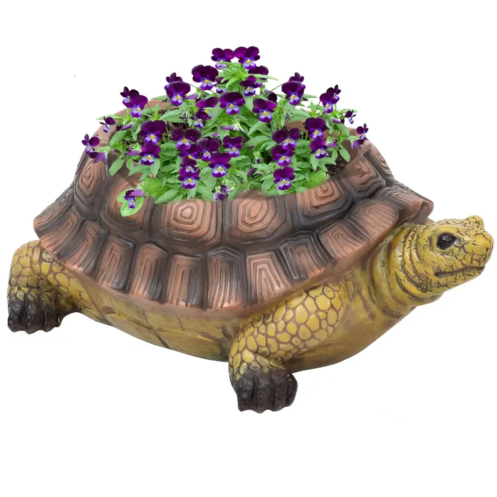 Add a bit of charm and display your favorite greens, daisies, herbs, or vegetables throughout your home with the Teddy the tortoise. Teddy is a garden planter designed for indoor or outdoor use, ready to keep your plants thriving no matter where he's placed. This durable accessory is constructed of strong polyresin that beautifully replicates details of Teddy's shell and body. This material can withstand the elements outdoors, yet it also lightweight and can easily be moved around to your preferred location. This adorable animal planter is a great addition to bring a smile to any guest when placed on your patio, deck, in your yard, garden, or other landscaped area, or even indoors in your indoor porch, front entryway, or living area. He will also look right at home near the front door, ready to greet guests and passerby with some greenery on his back. Place next to a pond for a more realistic, fun touch.• CUTE LITTLE PLANTER: Flower pot is 11.5 inches wide x 7.5 inches deep x 4.5 inches tall; Weighs 2.6 pounds; Section of planter that holds soil and plants is 7.25 inches wide x 5 inches deep x 3.5 inches tall; Opening of planter is 5.75 inches wide x 4.25 inches deep; Features a 1-inch diameter drainage hole at the bottom with a removable plug; Planter has a soil capacity of 2.2 quarts (0.55 gallons, 70 ounces or 0.073 cubic feet)• PERFECT IN THE GARDEN: Planter is constructed of durable and lightweight polyresin; Material is designed to withstand the elements and can easily be moved around to your preferred location outdoors• GREAT ON THE PATIO: Product includes 1 outdoor planter statue in the shape of a tortoise; It makes a great addition to a variety of outdoor living spaces for a whimsical touch• NICE GIFT IDEA: Novelty planter will make a great present for someone who adores turtles or tortoises, or as a unique planter for a gardener or outdoor enthusiast; Makes an eye-catching addition to any outdoor landscape• WORRY-FREE PURCHASING: Sunnydaze Decor backs its products with a 1-year manufacturer's warranty.