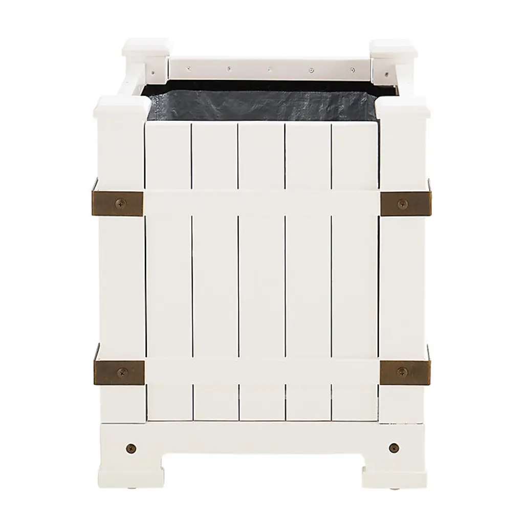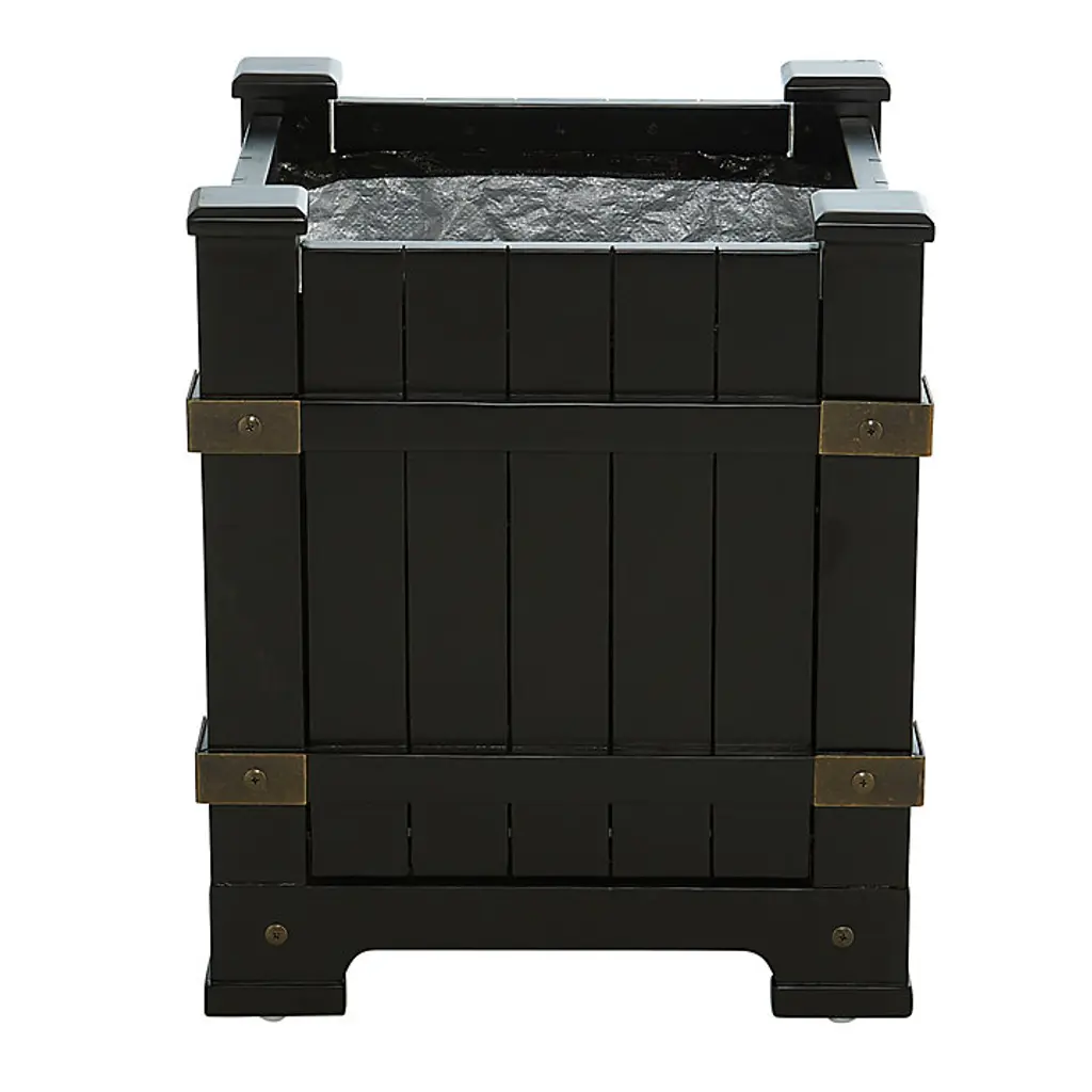 Suzanne Kasler designed this stylish planter in the spirit of Britain's 19th Regency period, famed for its decorative refinement and sophistication. Suzanne's square 20-inch planter is artisan crafted of FSC-certified eucalyptus wood strengthened at each corner with a pair of riveted brass-finish metal brackets. Interior is lined with PVC to keep water and soil neatly in place. Enjoy this striking planter box indoors or place it on your porch or covered patio to dress up potted trees or greenery. Suzanne Kasler Regency Planter features: