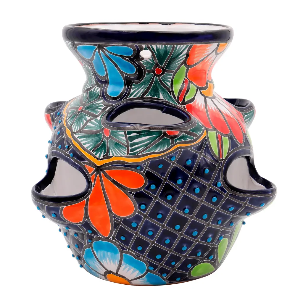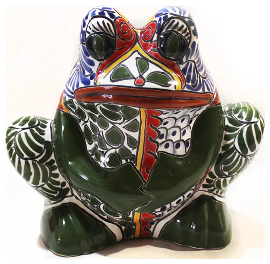 Garden or patio plants will literterally "jump out" at you from this attractive frog planter. They are all high-fired and hand painted.Talavera pottery is extremely colorful and has a very durable finish. All of the tableware and service pieces are dishwasher and microwave safe. Along with all of the pieces which would be associated with tableware and service we do carry a great assortment of products for the garden and patio as well.