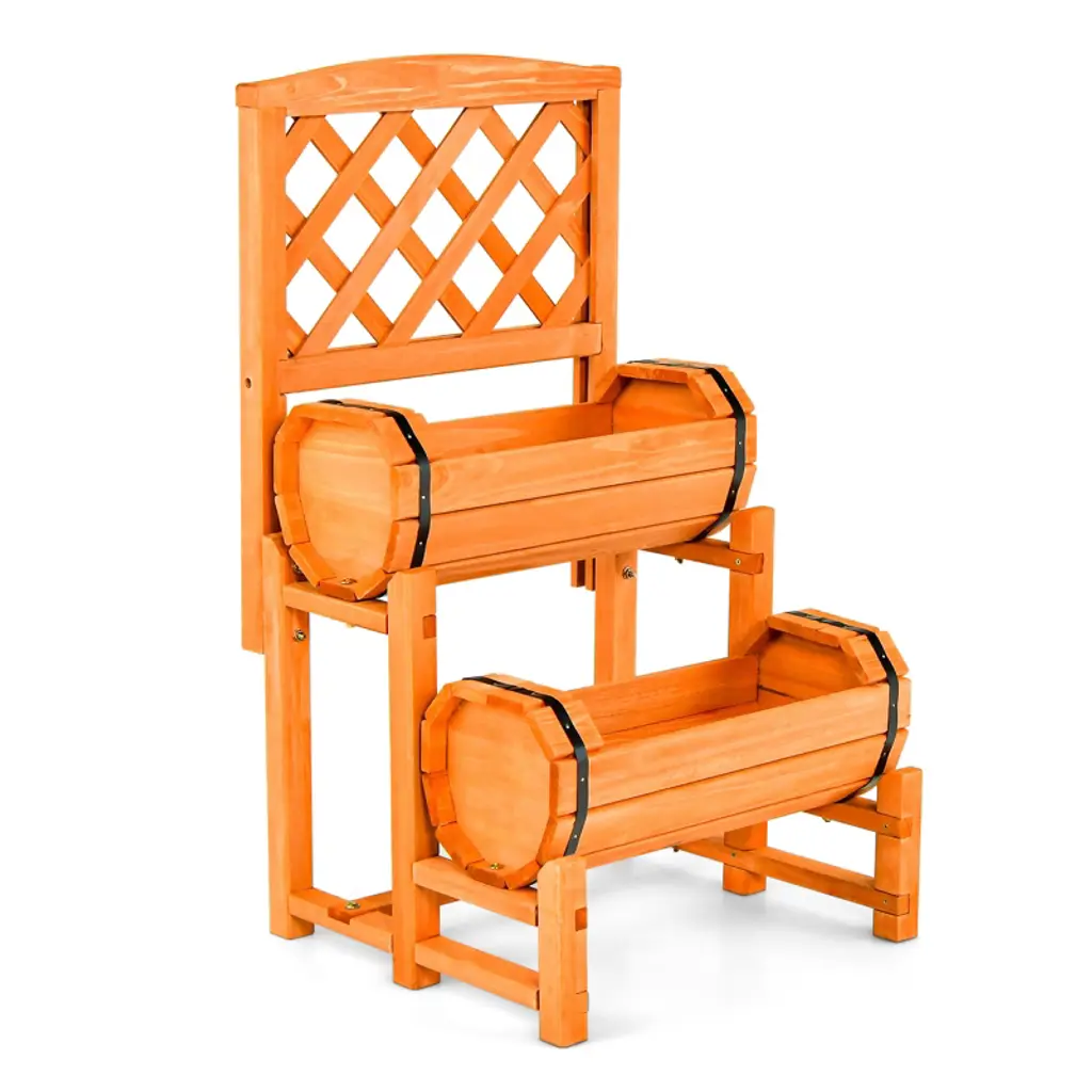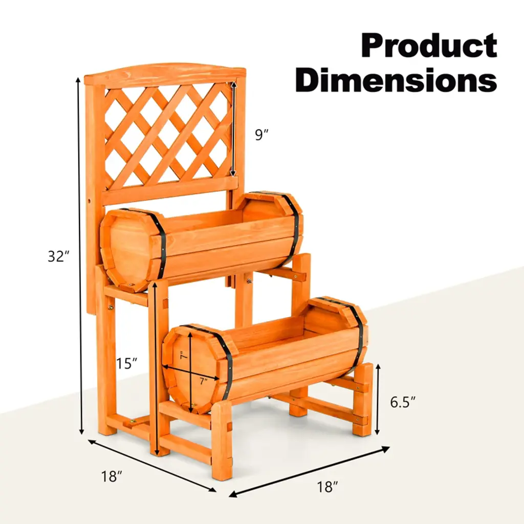 Add a touch of green to your place! Measures 18" x 18" x 32" (L x W x H), the combination of 2 planter boxes and trellis provides diverse planting modes and large planting area for you. The sturdy and crack resistant natural fir wood promise a long service life of the planter container. In addition, the raised feet reinforced by wooden sticks, protect the bottom while adding good ventilation to the planter, the increased ventilation is good for plant to grow and prevent rotting. Its light weight of 9 lbs allows you to enjoy the beauty of plants anywhere you like, such as garden, bedroom, balcony, etc.FeaturesMade of 100% nature fir wood which is sturdy and good looking.Two planting boxes create a classified planting space.Trellis behind the planter offers growing space for the climbing plants.The frame reinforced with bars and screws is resistant to deformation.Coated with waterproof paint, suitable for outdoor use.It doesn't take up much space and can be placed in any room you want.The numbered parts are easy to assemble.Specifications: Color: Orange Material: Fir Wood, Metal Overall Dimensions: 18" x 18" x 32" (W x D x H) Size of Each Planter Box: 18" x 7" x 7" (W x D x H) Interior Size of Each Planter Box: 15" x 6" x 6.5" (W x D x H) Weight Capacity of Each Planter Box: 22 lbs Net Weight: 9 lbs Package includes: 1 X Planter 1 X User Guide