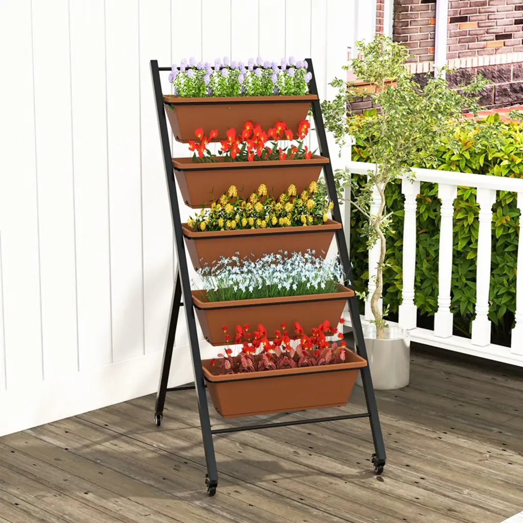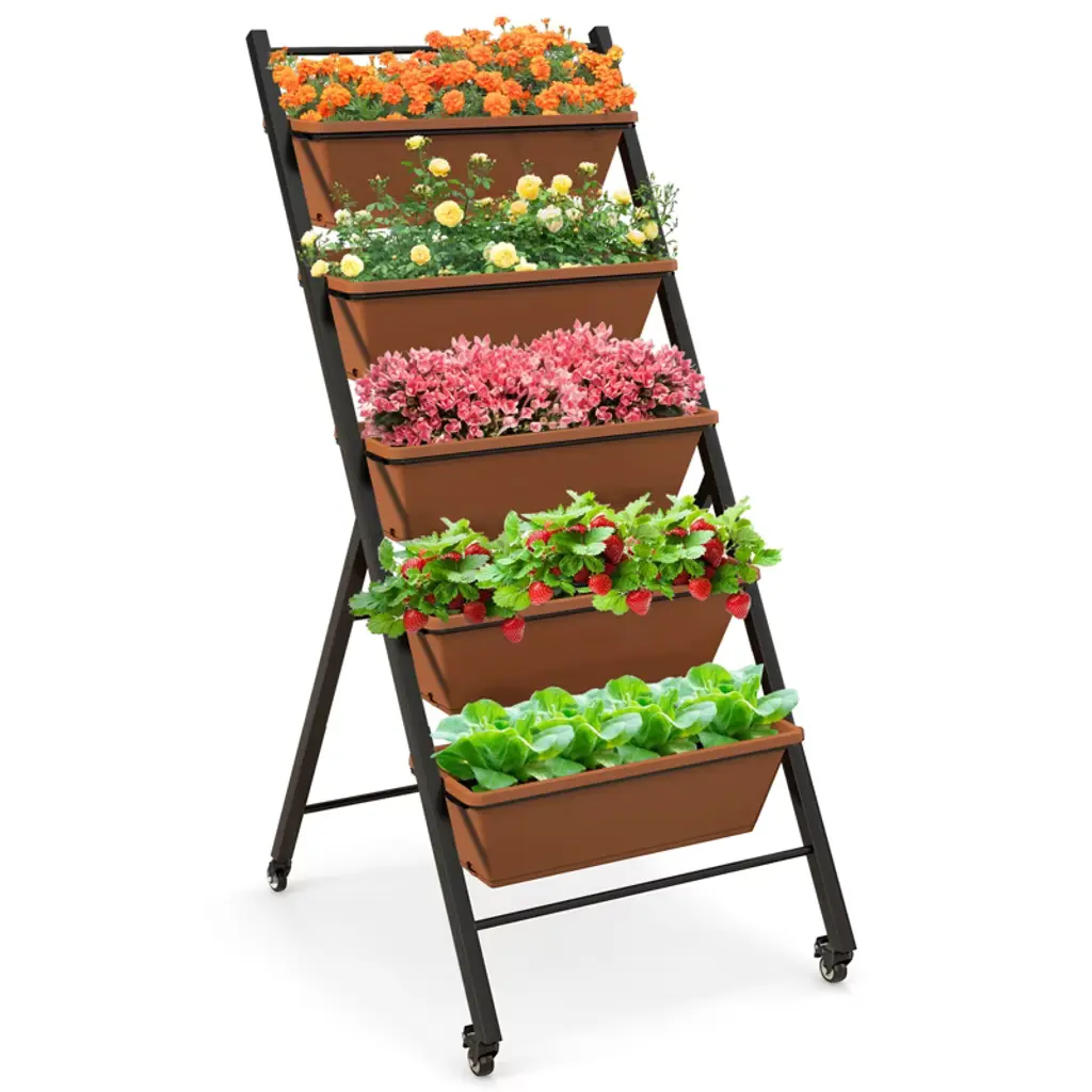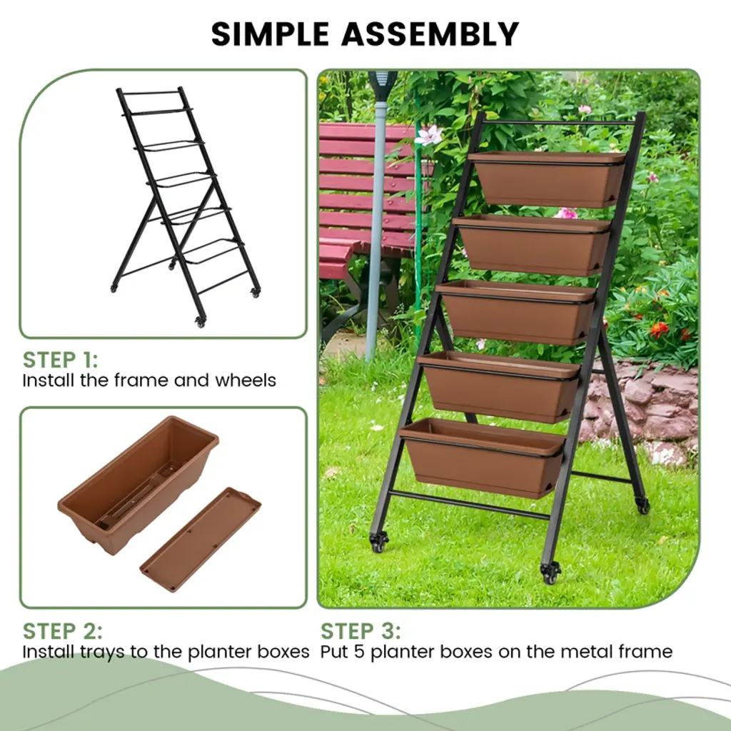 Enjoy Your Gardening Work! Our 5-layer vertical raised garden bed measures 22.5" x 29" x 50" (L x W x H) and comes with 5 large planter boxes, providing large space for cultivating different plants. And 5 planter boxes in a vertical design make plants of each layer to enjoy full sunlight and better growth. And each container box is equipped with a removable tray and multiple drainage holes for self-priming irrigation, allowing roots to aerate while having moisture nearby. Other than that, it adopts a stable triangular structure and a high-strength powder-coated metal frame, which is rustproof, weather-resistant, and deformation-resistant, ensuring long-term outdoor use. Thanks to 4 flexible wheels, you can easily move it for daily gardening, and 2 wheels can be locked for safety. Each planter box can be detached, so it is great for keeping away from constantly bending plantation work. Whether planting indoors or outdoors, our freestanding planter could be a perfect choice!FeaturesThe planter box is made of 100% new PP material, strong and long-lasting enoughThe powder-coated metal frame is not easy to rust, peel, or chip, resist deformAdopts a stable triangular structure, not easy to wobble, keep safeDesigned with a removable tray, offers space for reserving excess waterThe drainage holes on the bottom promote water drainage and air circulation5 large planter boxes provide enough space for cultivating different plantsEquipped with four 360° swiveling wheels, 2 wheels can be lockedSpecifications: Color: Brown Material: PP, Metal Overall Dimensions: 22.5" x 27" x 50" (W x D x H) Ground Clearance of Each Layer: 13.5"/21.5"/29.5"/37.5"/45.5" Size of the Planter Box: 19.5" x 7.5" x 6.5" (W x D x H) Net Weight: 20 lbs Package Includes: 1 x Vertical Raised Garden Bed 1 x User's Manual