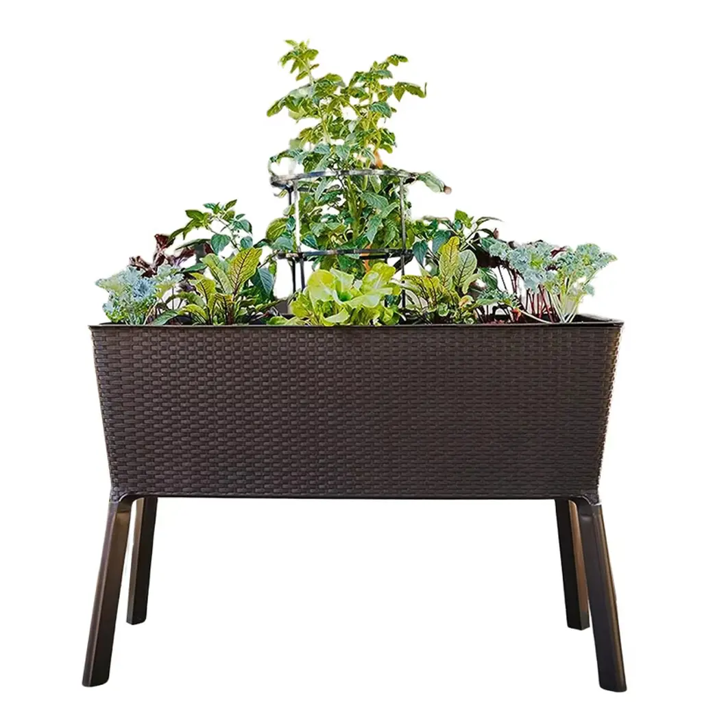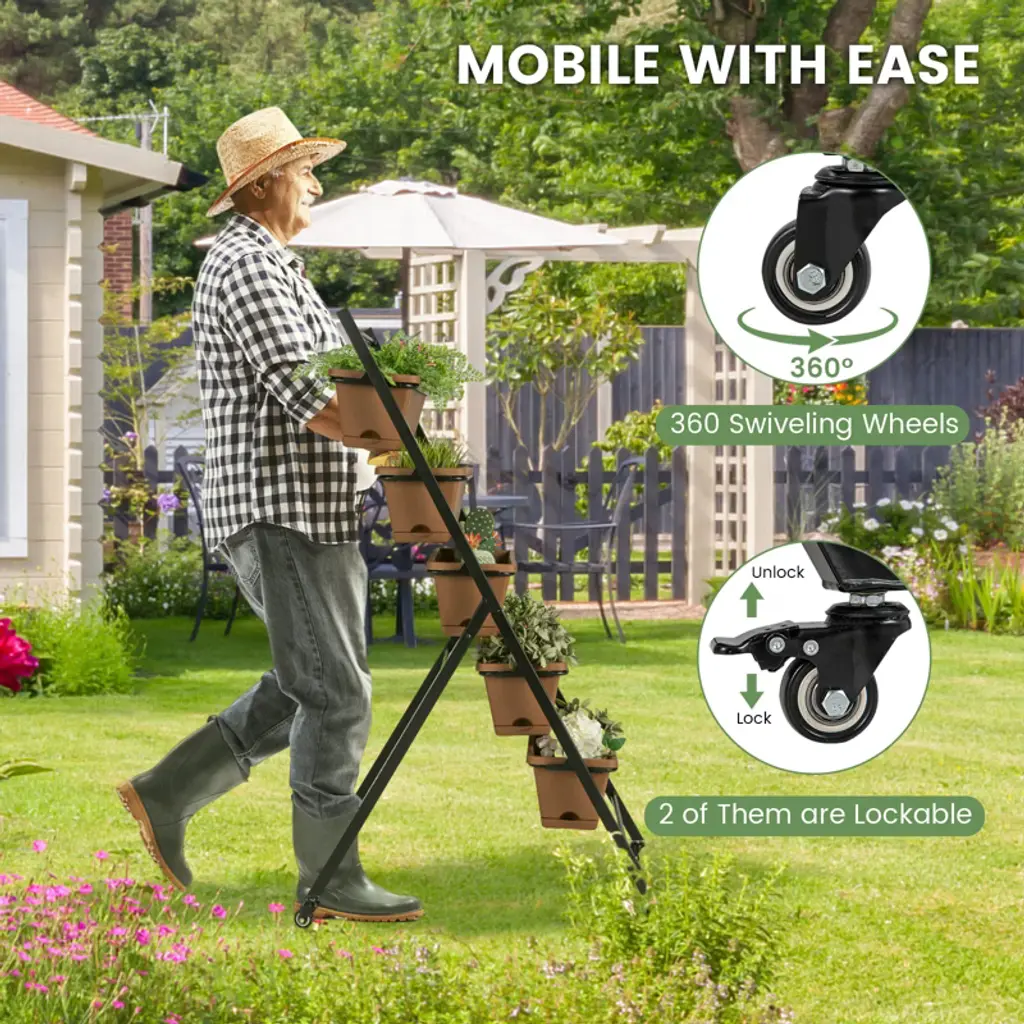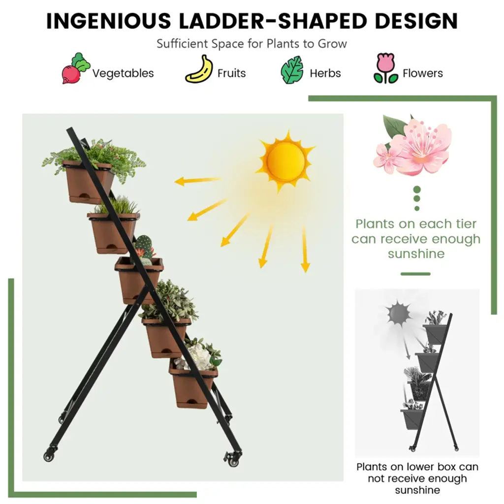 Enjoy Your Gardening Work! Our 5-layer vertical raised garden bed measures 22.5" x 29" x 50" (L x W x H) and comes with 5 large planter boxes, providing large space for cultivating different plants. And 5 planter boxes in a vertical design make plants of each layer to enjoy full sunlight and better growth. And each container box is equipped with a removable tray and multiple drainage holes for self-priming irrigation, allowing roots to aerate while having moisture nearby. Other than that, it adopts a stable triangular structure and a high-strength powder-coated metal frame, which is rustproof, weather-resistant, and deformation-resistant, ensuring long-term outdoor use. Thanks to 4 flexible wheels, you can easily move it for daily gardening, and 2 wheels can be locked for safety. Each planter box can be detached, so it is great for keeping away from constantly bending plantation work. Whether planting indoors or outdoors, our freestanding planter could be a perfect choice!FeaturesThe planter box is made of 100% new PP material, strong and long-lasting enoughThe powder-coated metal frame is not easy to rust, peel, or chip, resist deformAdopts a stable triangular structure, not easy to wobble, keep safeDesigned with a removable tray, offers space for reserving excess waterThe drainage holes on the bottom promote water drainage and air circulation5 large planter boxes provide enough space for cultivating different plantsEquipped with four 360° swiveling wheels, 2 wheels can be lockedSpecifications: Color: Brown Material: PP, Metal Overall Dimensions: 22.5" x 27" x 50" (W x D x H) Ground Clearance of Each Layer: 13.5"/21.5"/29.5"/37.5"/45.5" Size of the Planter Box: 19.5" x 7.5" x 6.5" (W x D x H) Net Weight: 20 lbs Package Includes: 1 x Vertical Raised Garden Bed 1 x User's Manual