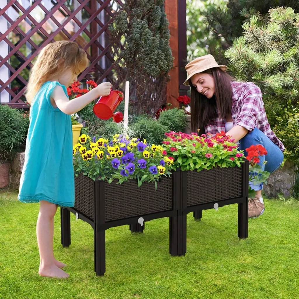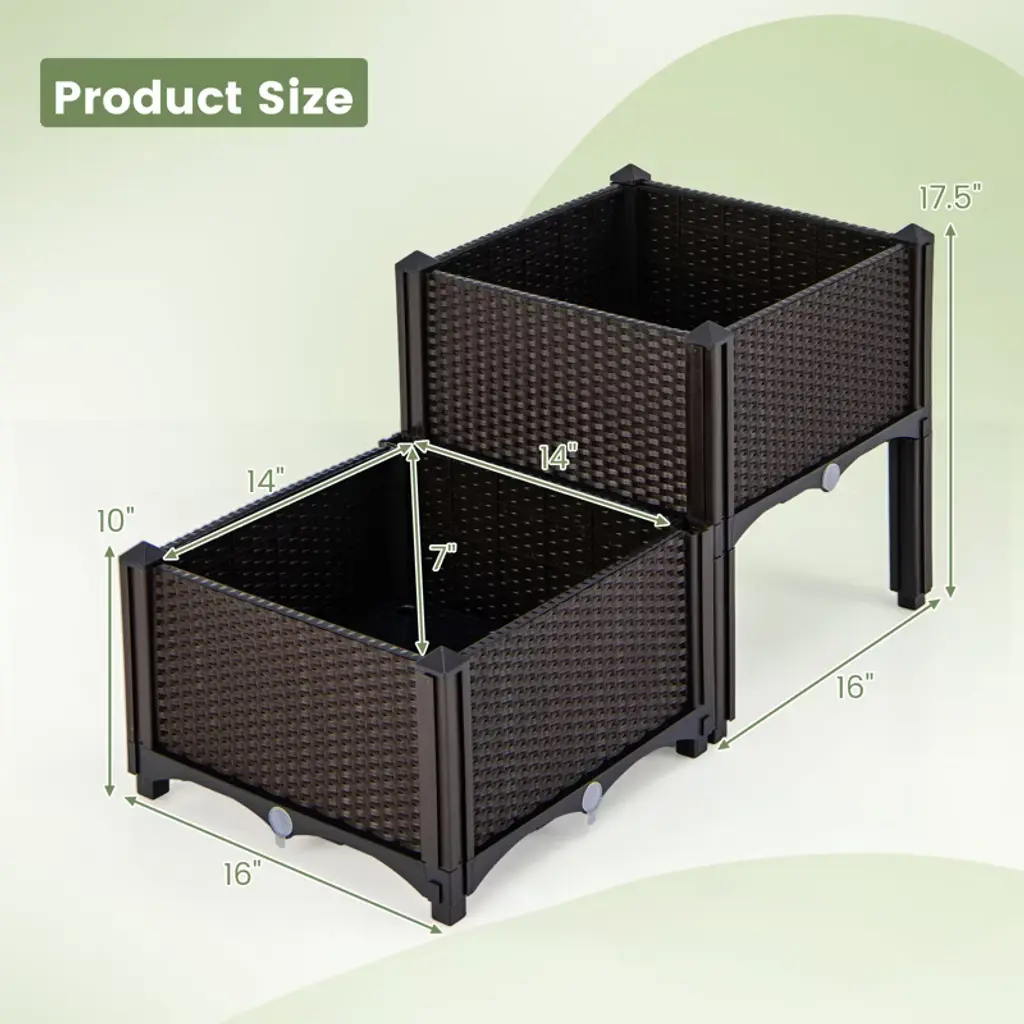 This is one of our planter and can be a great help with your plants. The implants are artificially designed to allow users to grow plants without bending over, even for people with waist injuries. The implant is made of environmentally friendly PP material, with more stable structure and longer life. There is also a spacious growing area with flowers, herbs, succulents and ferns. A variety of combinations can meet your various needs and add different colors to your garden. Efficient drainage prevents water accumulation and provides space for storing extra water, which allows plants to grow better. This pot is perfect for gardens, balconies, backyards and florist shopsFeaturesAmple space allows you to grow different plants in different pots at the same time2 Sets/4 Sets can be combined in a variety of waysMade of environmentally friendly PP material, it can last longerGood drainage allows plants to grow betterEasy installation, no tools, according to the instructions can be quickly completed installationIt can be used to grow plants, fruits, flowers and herbsIdeal for garden, balcony, backyard and flower shopSpecifications: Color: Brown Material: PP Overall Dimensions of One Complete Box: 16" x 16" x 18" (W x D x H) Height of the Elevated Leg: 8.5" Net Weight: 10.5/21 lbs Package Included: 2/4 x Raised Garden Bed 1 x Instruction