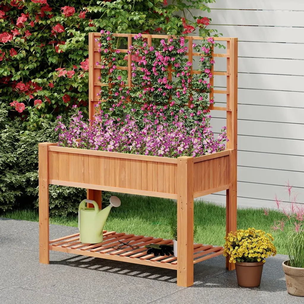 Embrace efficient gardening with the raised garden bed. Constructed of fir wood known for its solid property, the planter box enhances your gardening experience by enabling the cultivation of flowers, herbs, or vegetables. It includes a trellis that not only supports climbing plants but also serves as a frame for hanging decorative elements. A removable liner is designed to protect the garden bed from water damage. To keep proper soil humidity, the planter box is equipped with 4 drainage holes and gaps. Below the bed, a slatted shelf avoids water retention while providing a storage area for gardening tools. The elevated structure of the planter protects your plants from small animals.FeaturesCrafted from high quality fir wood, which is non-deformable and natural Large planter bed allows you to grow vegetables, herbs or flowers Climbing trellis will support vines or hangs decorative itemsSpecifications:Color: Brown Material: Fir Wood Product Dimensions: 45" x 23" x 59" (W x D x H) Interior Size of the Planter Box: 43" x 20.5" x 8" (L x W x H) Weight Capacity of the Planter Box: 110 lbs Weight Capacity of the Storage Shelf: 88 lbs Net Weight: 24 lbs Package Includes: 1 x Wooden Raised Garden Bed with Trellis 1 x User's Manual