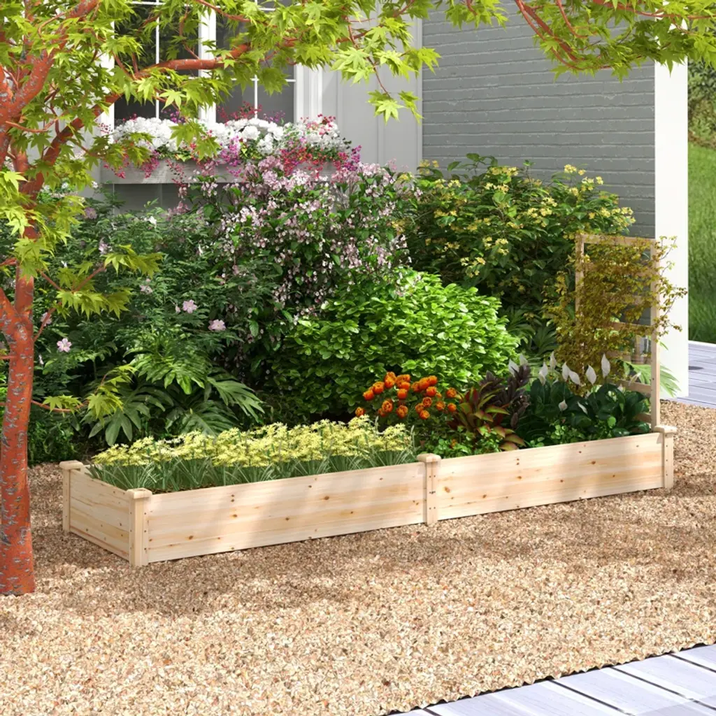 Transform your garden into a masterful work of art with the raised garden bed with trellis! The large planter box measures 93” x 25” x 40” (L x W x H), offering a spacious space for vegetables, flowers, herbs and fruits to thrive. Besides, the versatile planting box consists of 2 compartments, allowing different plants to grow without disturbing each other. In addition, the raised garden bed boasts an open-ended base to ensure excellent drainage and ventilation, guaranteeing healthy growth for your plants. Besides, the garden bed comes with a practical trellis, which not only provides strong support for climbing plants, but also allows you to hang some decorations. Made of long-lasting fir wood, the garden planting bed is resistant to warping or cracking, allowing you to enjoy its benefits for years to come. An added bonus is the natural wood surface, which can be easily to different colors to suit your personal taste and garden design.Features100% natural fir wood is safe and non-deformableLarge planter box with divider allows different plant species to growFunctional trellis allows climbing plants to grow vertically Plants can absorb nutrients from the deep soil with open-ended bottomEasy to assembly slotted legs save your energy0.6” thick wood boards and reinforced corners add sturdiness Paint as you like to match with your garden, patio and yardSpecifications: Color: Natural Material: Fir Wood Overall Dimensions: 93” x 25” x 40” (W x D x H) Interior Size of the Planting Box: 89” x 22” x 9” (W x D x H) Size of the Planting Trellis: 19” x 40” (W x D) Volume: 0.3 m3/10 cu.ft Weight Capacity of the Trellis: 22 lbs Net Weight: 20 lbs Package Includes: 1 x Wooden Raised Garden Bed 1 x User’s Manual