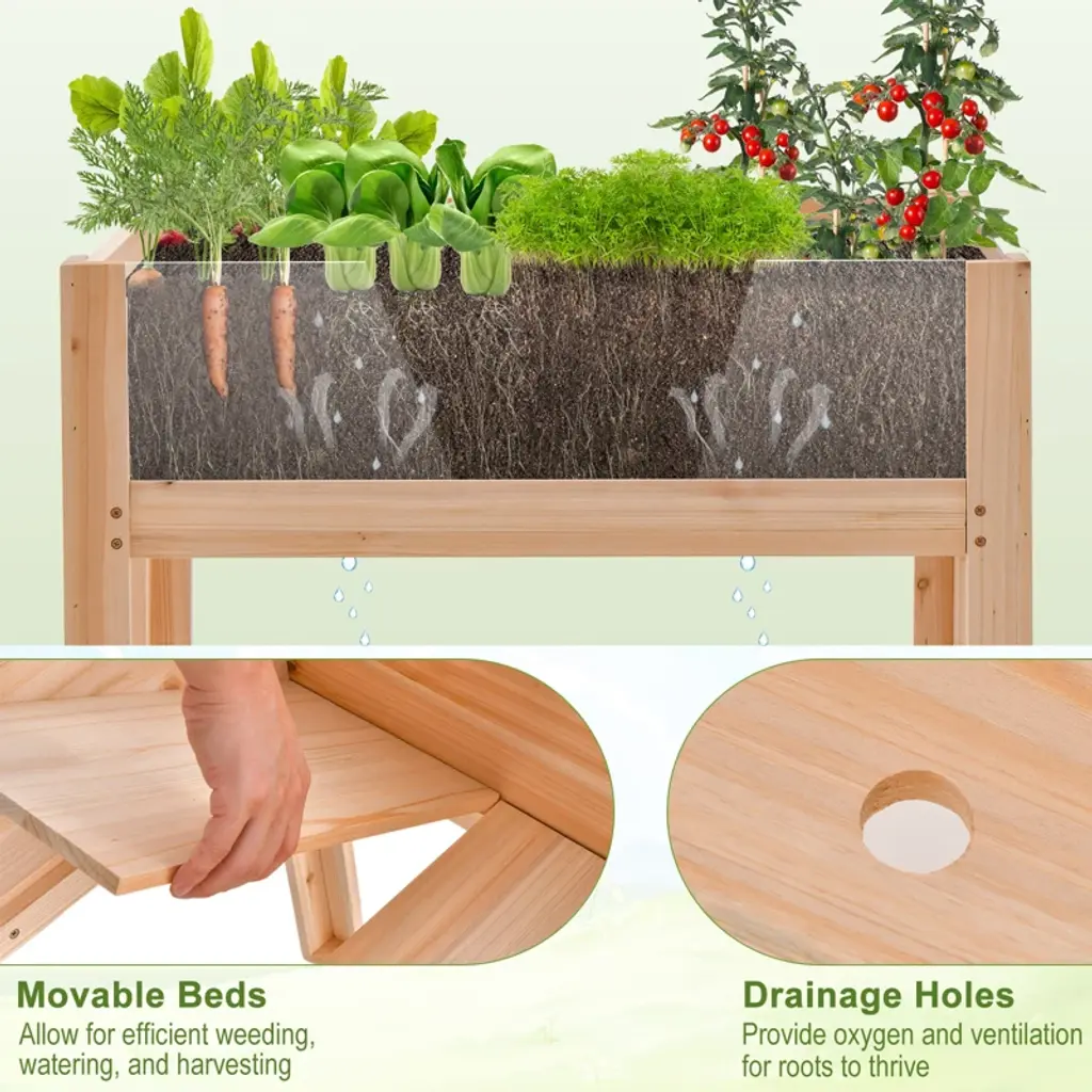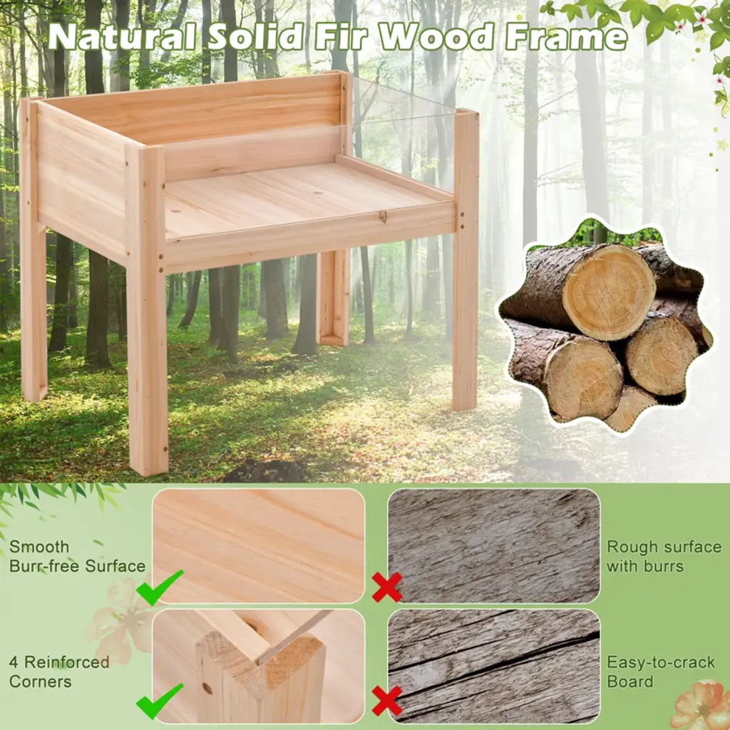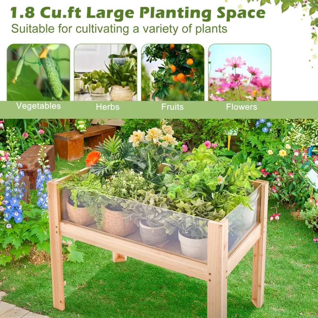Refresh your gardening space with this novel raised garden bed! Designed with 2 acrylic panels on the sides, the elevated garden bed offers visible view for you to observe the growth of the plants. And large planting space allows you to cultivate various types of plants like vegetables, fruits, herbs, flowers etc. Made of 100% natural solid fir wood, the planting box with legs ensures high durability for indoor or outdoor use. For better managing the plants, it’s also built with drainage holes and movable beds. Even better, the ergonomic elevated height design enables you to water the plants without bending over. Apart from being used as the planter box, it serves well as the plant display stand or animal terrarium.Features1.8/5.7 cu.ft large planting space for vegetables, fruits, flowers or herbsCan be used to cultivate plants or animals, display potted plants Transparent acrylic panels enable you to view the plant’s state100% natural solid fir wood frame for high sturdiness & durabilityDrainage holes drain away excess water & maintain soil nutrientsElevated height design allows for easy gardening with no back painMovable boards make it easier for weeding, watering, or harvestingSpecifications: Color: Natural Material: Fir Wood, Acrylic Net Weight: 12.5lbs/22 lbs Overall Dimension: 30" x 18" x 24"/47" x 23" x 31"(L x W x H) Inner Dimension: 27.5" x 16" x 7.5"/45" x 21" x 10"(L x W x H) Capacity: 1.8/5.7 Cu.ft Weight Capacity: 100/220 lbs Package Includes: 1 x Raised Garden Bed 1 x Instruction