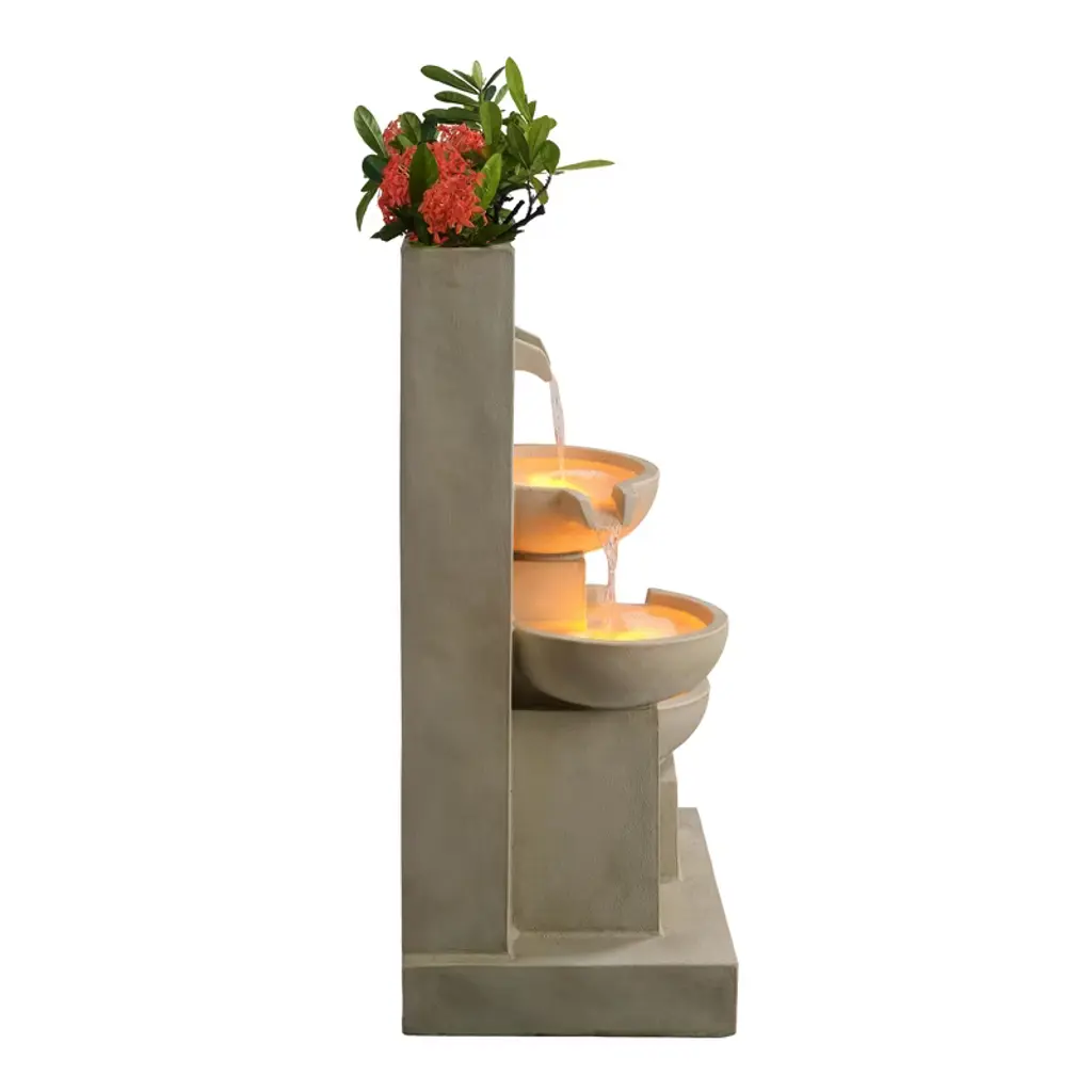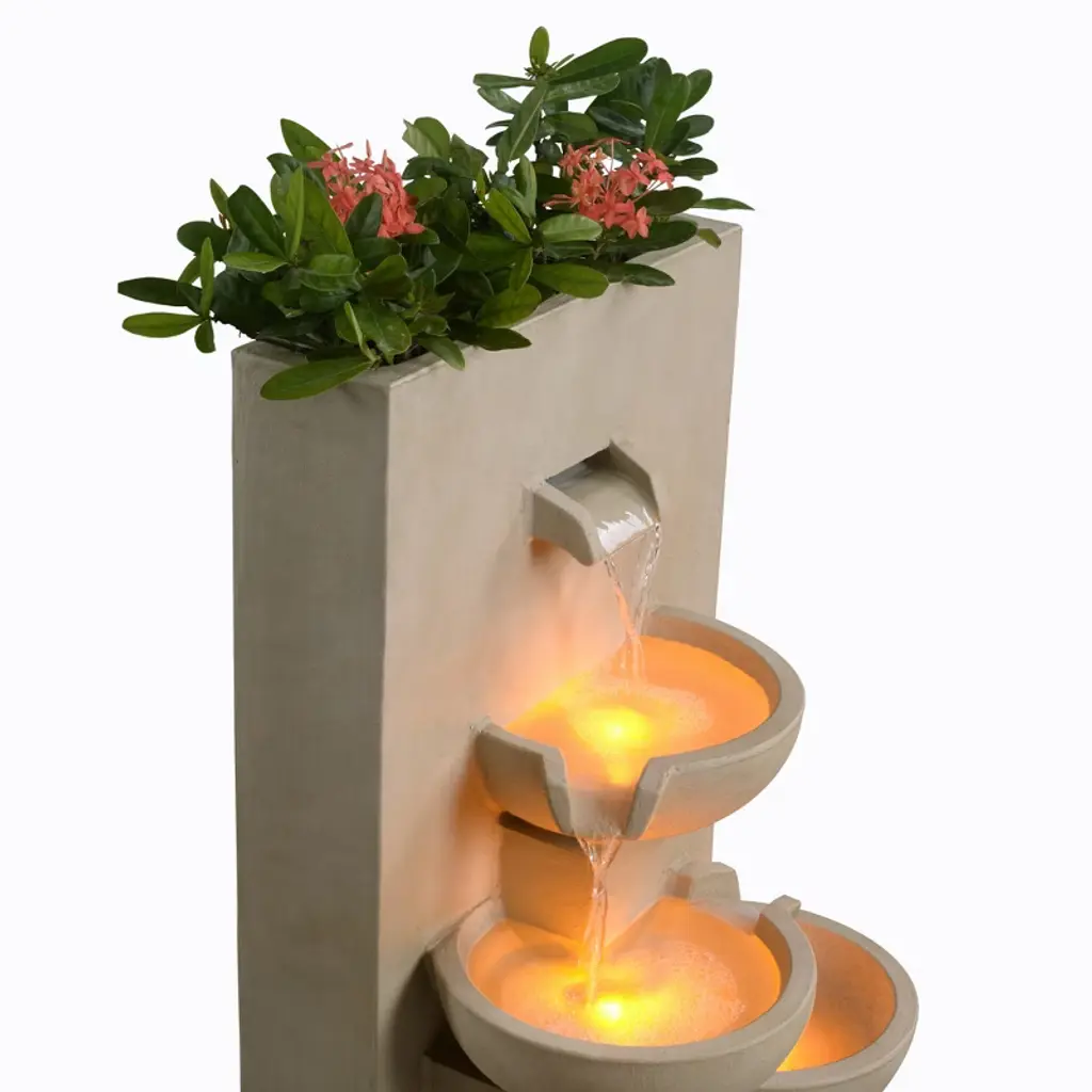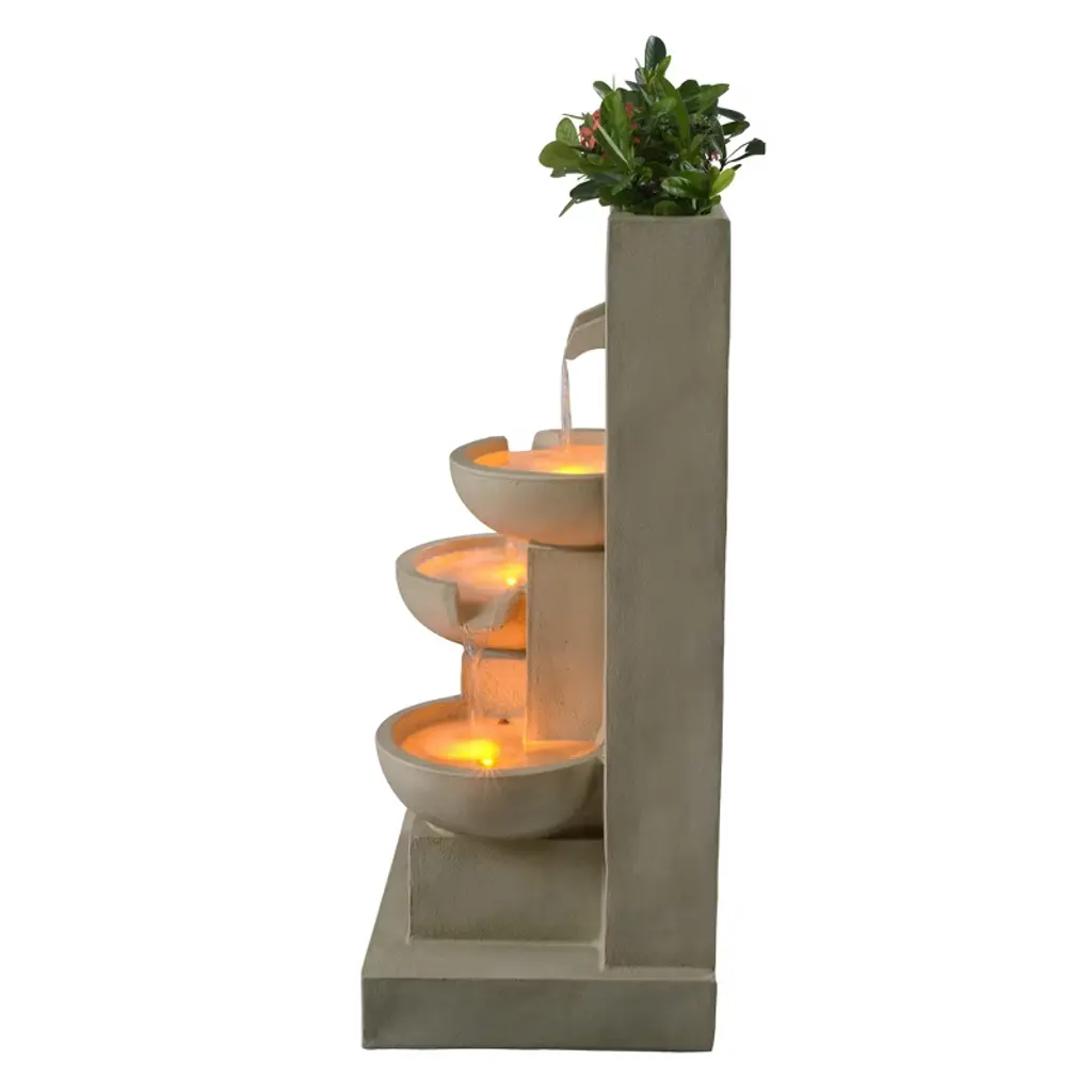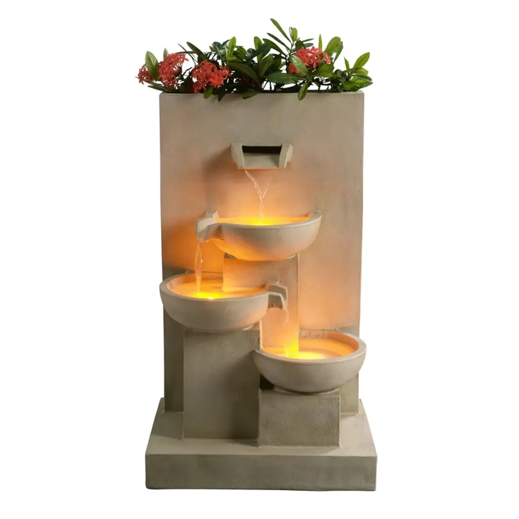 This contemporary-style outdoor water fountain features a smooth, natural finish with a planter on top. Water cascades down three staggered bowls, each illuminated by solar-powered LED lights. Made of weather-resistant materials, plants not included.