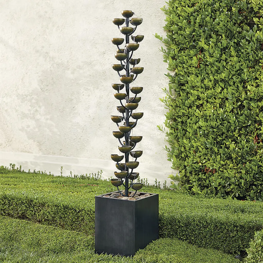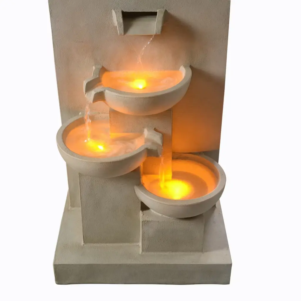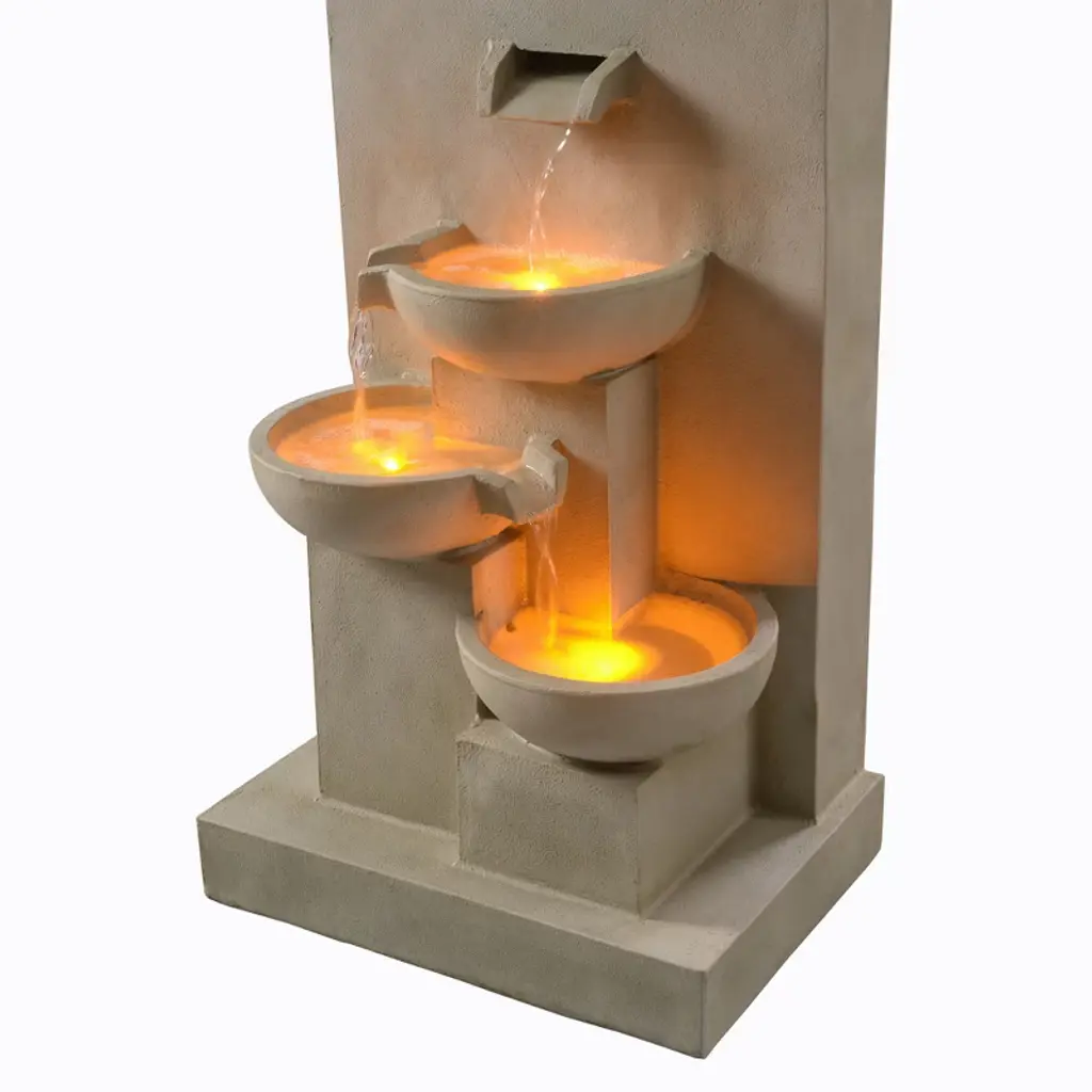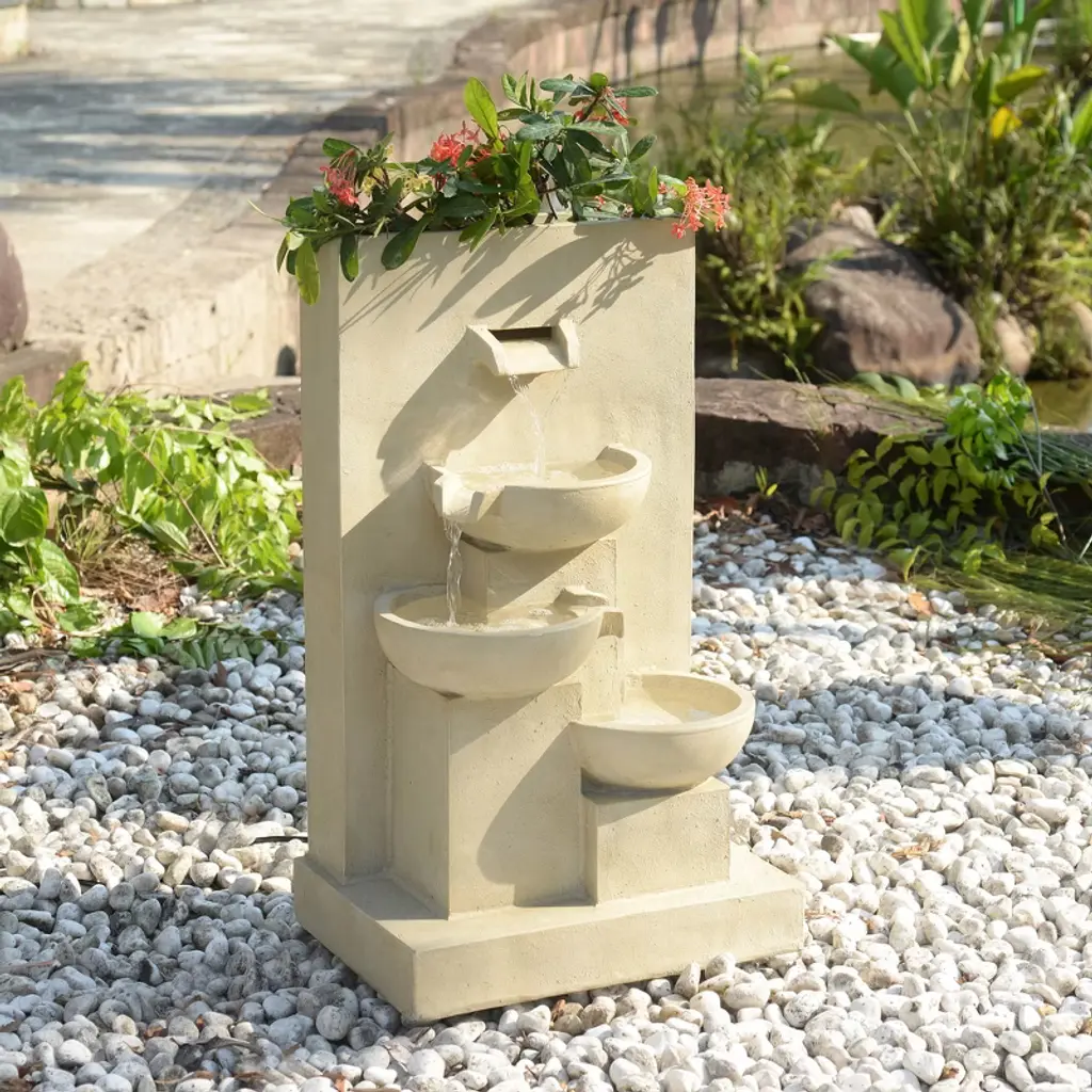 This contemporary-style outdoor water fountain features a smooth, natural finish with a planter on top. Water cascades down three staggered bowls, each illuminated by solar-powered LED lights. Made of weather-resistant materials, plants not included.
