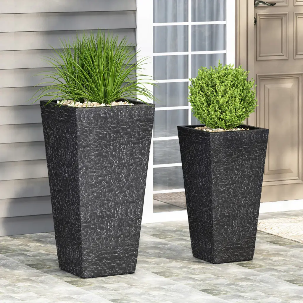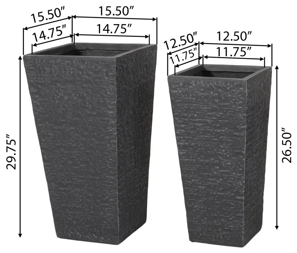 Add a touch of greenery or blooming colors to your outdoor space. From its stunning stone texture to its lightweight concrete structure, our tapered planter set will instantly enhance your patio or backyard space with style. This set comes with one large planter and one medium planter, offering a durable construction to ensure that your plants have a stable home to grow. Complemented with a gray finish, this planter set is perfectly crafted to hold your plants, making these the ideal accessories for your green thumb.• • A TOUCH OF PERSONALITY: Bring your outdoor area to life with our delightful cast stone planter set. With a sleek tapered structure, these accessories will not only enliven your backyard or patio space but also provides space to grow plants.• • CAST STONE: Constructed with lightweight concrete, this planter set offers a natural stone look with a chic stone texture that also has a highly durable structure and is resistant to outdoor elements.• • DRAINAGE HOLE INCLUDED: Each planter includes a drainage hole at the bottom so that excess water will not pool. This prevents water from becoming stagnant, which promotes healthier roots.• • DIMENSIONS: Choose an accessory that is the perfect size for you and your outdoor space. This set of two comes with one large planter that measures to be 15.50" W x 15.50" D x 29.75" H and one medium planter that measures to be 12.50" W x 12.50" D x 26.50" H. You will love how much your space can transform with the simple addition of this accessory set.• • NO ASSEMBLY: This planter set comes ready to use straight out of the box. No assembly is required.Includes: Two (2) Planters• Material: Lightweight Concrete• Finish: Gray• No Assembly Required• Large Dimensions: 15.50 inches deep x 15.50 inches wide x 29.75 inches high• Large Inner Dimensions: 14.75 inches deep x 14.75 inches wide x 29.00 inches high• Medium Dimensions: 12.50 inches deep x 12.50 inches wide x 26.50 inches high• Medium Inner Dimensions: 11.75 inches deep x 11.75 inches wide x 26.00 inches high