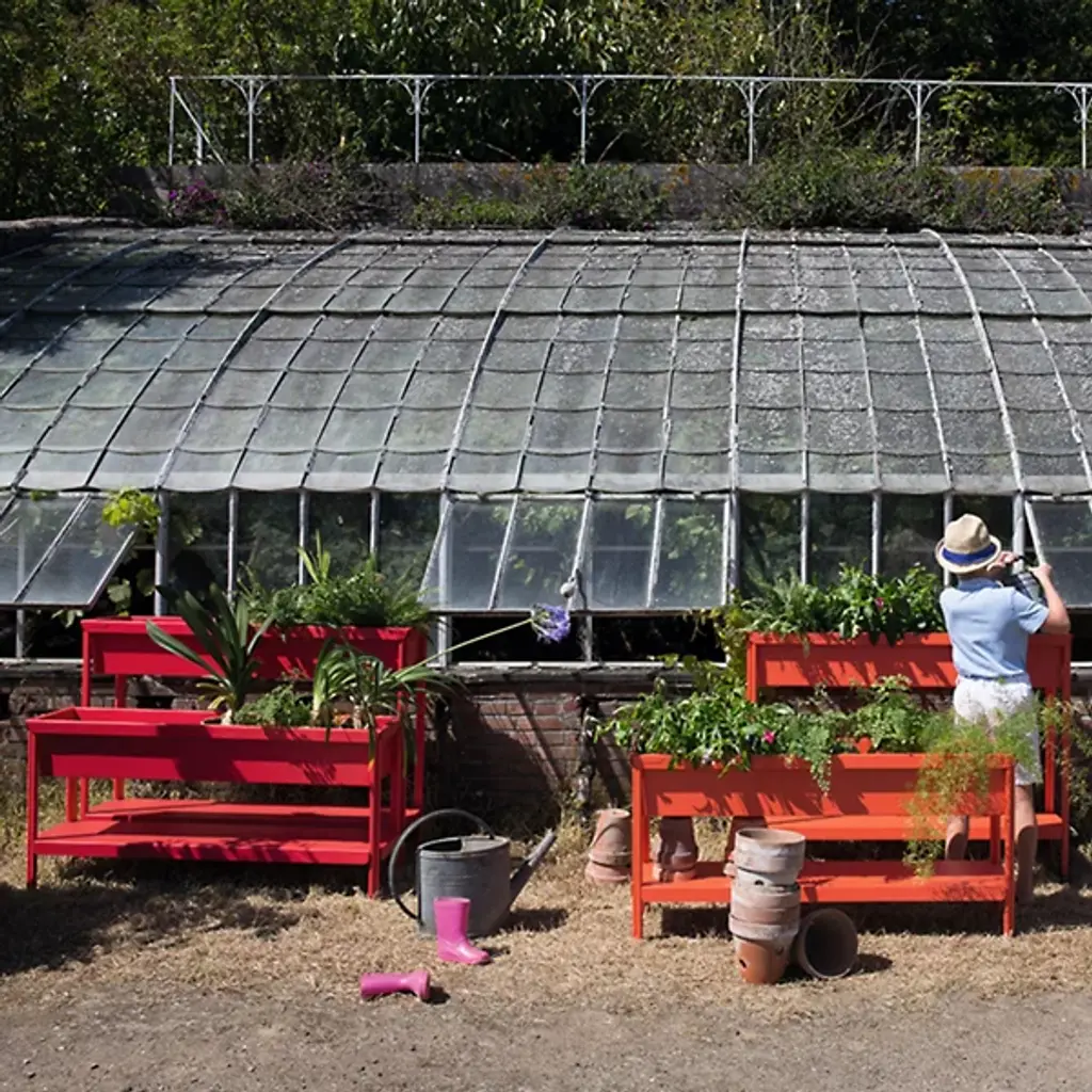 A patio brimming with blossoms. The Terrazza Medium Planter by Fermob is a stylish addition to a patio, deck or garden. Made with a solid Steel tubular frame base with a Sheet Steel tray, the clean lined planters are powder coated for superior weather and UV protection. A generously sized plant holder lets you arrange favorite flowers, herbs and greenery in their original containers, with ample room for shifting plants around for optimal sun exposure and the best display. An additional shelf provides storage for extra flower pots, gardening tools and plant care accessories. The symmetrical design defines certain areas of a patio or deck for dining and lounging while bringing a touch of lively greenery to each space.