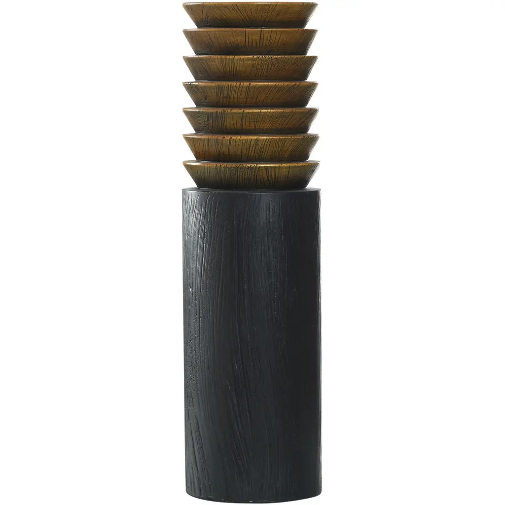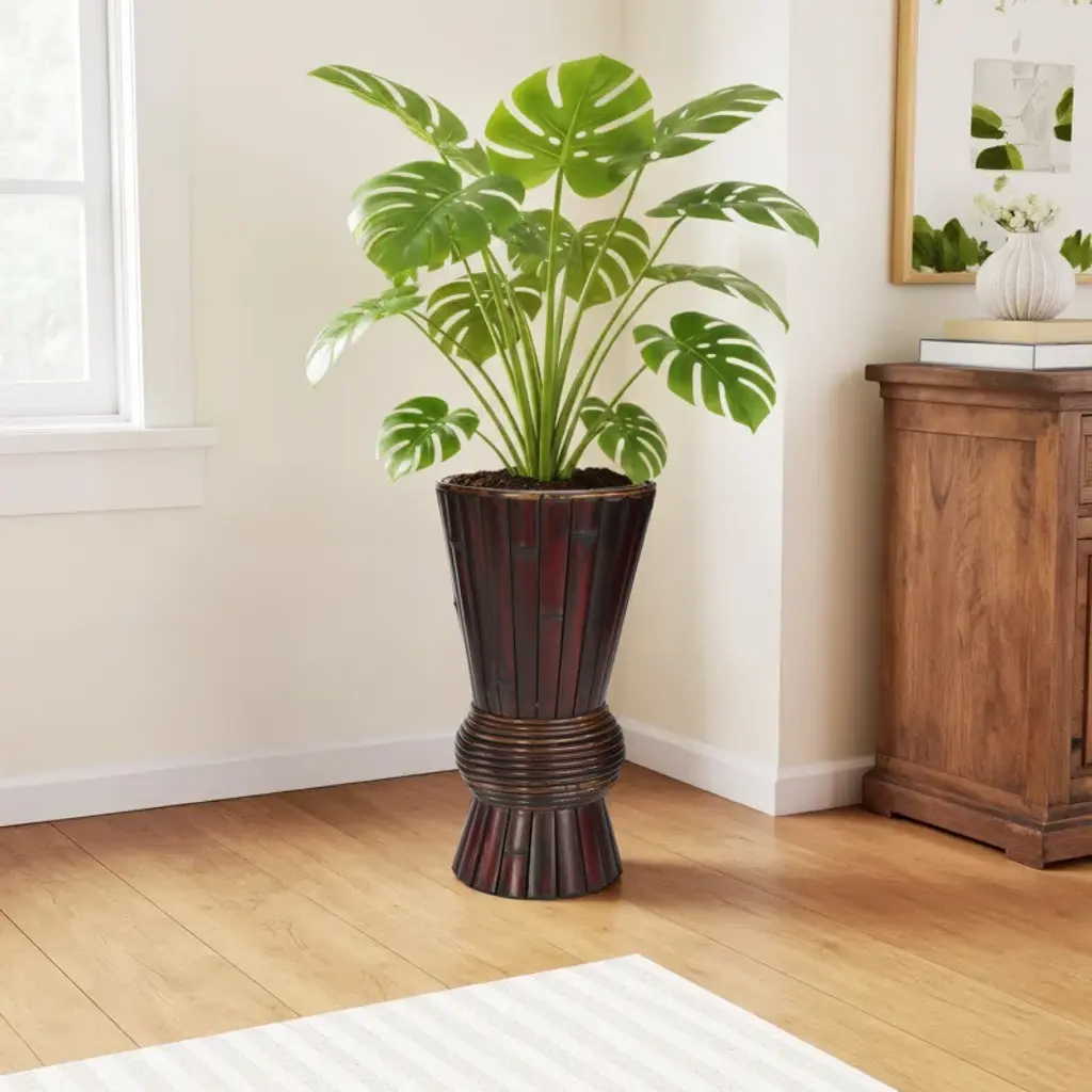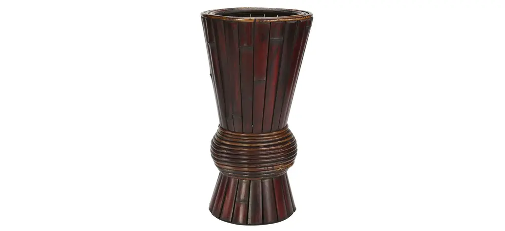 An interesting design that's sure to draw visitors in for a closer look. Our Bamboo Vase is an eye pleasing medley of burgundy-red hues sure to accent any arrangement you put inside it. Starting with a wide base for stability, the vase narrows to meet a multi-ring coffee colored design in various shades. The top extends outward to hold any Thisbe arrangement no matter the fullness.