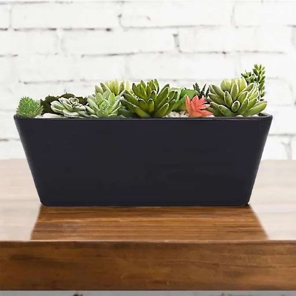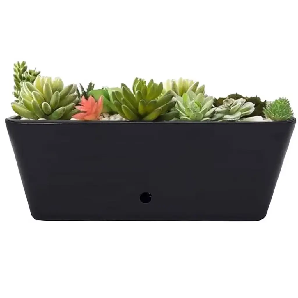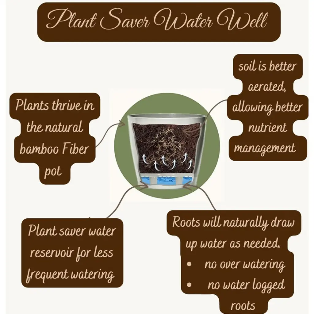 Worlds first Bamboo Fiber self-watering pot, this 16" Black Rectangular self-watering planter is made from sustainable, biodegradable, all natural Bamboo Fiber and corn starch. Plants thrive in this natural Bamboo Fiber planter that is plastic free. The soil is better aerated by the unique water well in the base, allowing better nutrient management, helping the plants grow healthy and strong. These planters should be treated like ceramic, suitable for use in hot or cold climates inside or outside. At initial planting, water from the top until water is just below the overflow. Then periodically check the water level in the base and add water to the well from the bottom access or from the top of the planter. The soil draws water up from the well as needed using capillary action just like a wick. No more overwatering, strong healthy plants is the result! Everyone gets a "green thumb" growing in bamboo planters and just by keeping water in the well! When you are finished with your planter just break it up and put into your compost bin. Over time the material will degrade back to nature.