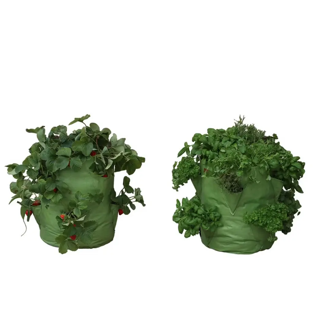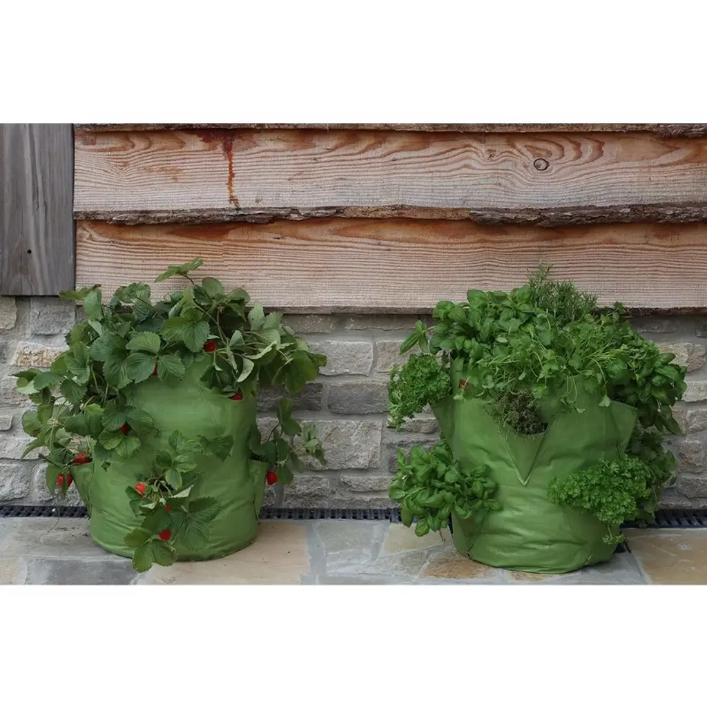 If you relish the flavor of succulent, home-grown strawberries or wish to enjoy freshly picked herbs for your culinary creations, the Haxnicks Strawberry & Herb Patio Planters make it simple to cultivate your own. They are ideal for urban gardens and limited spaces such as patios, balconies, and backyards. Each planter comes with a growing guide, detailed instructions, easy-to-carry handles, and solid brass reinforced, non-rusting drainage holes. They are reusable, fold flat for convenient storage, and can hold 11.9 gallons of planting medium. Tierra Garden, known for importing, designing, and manufacturing unique garden products, offers a wide selection of distinctive garden hardgoods, ensuring quality and variety. Dimensions of the product are 13.8"L x 17.7"W.