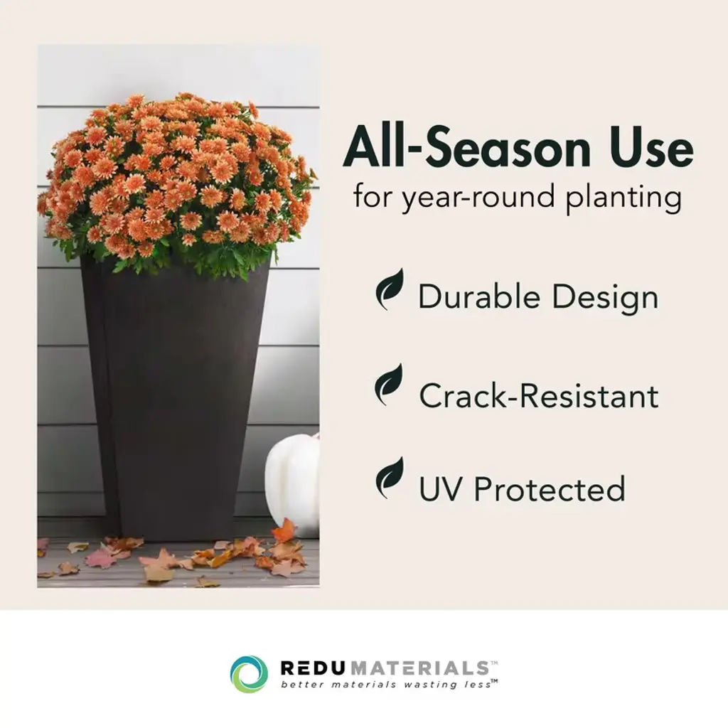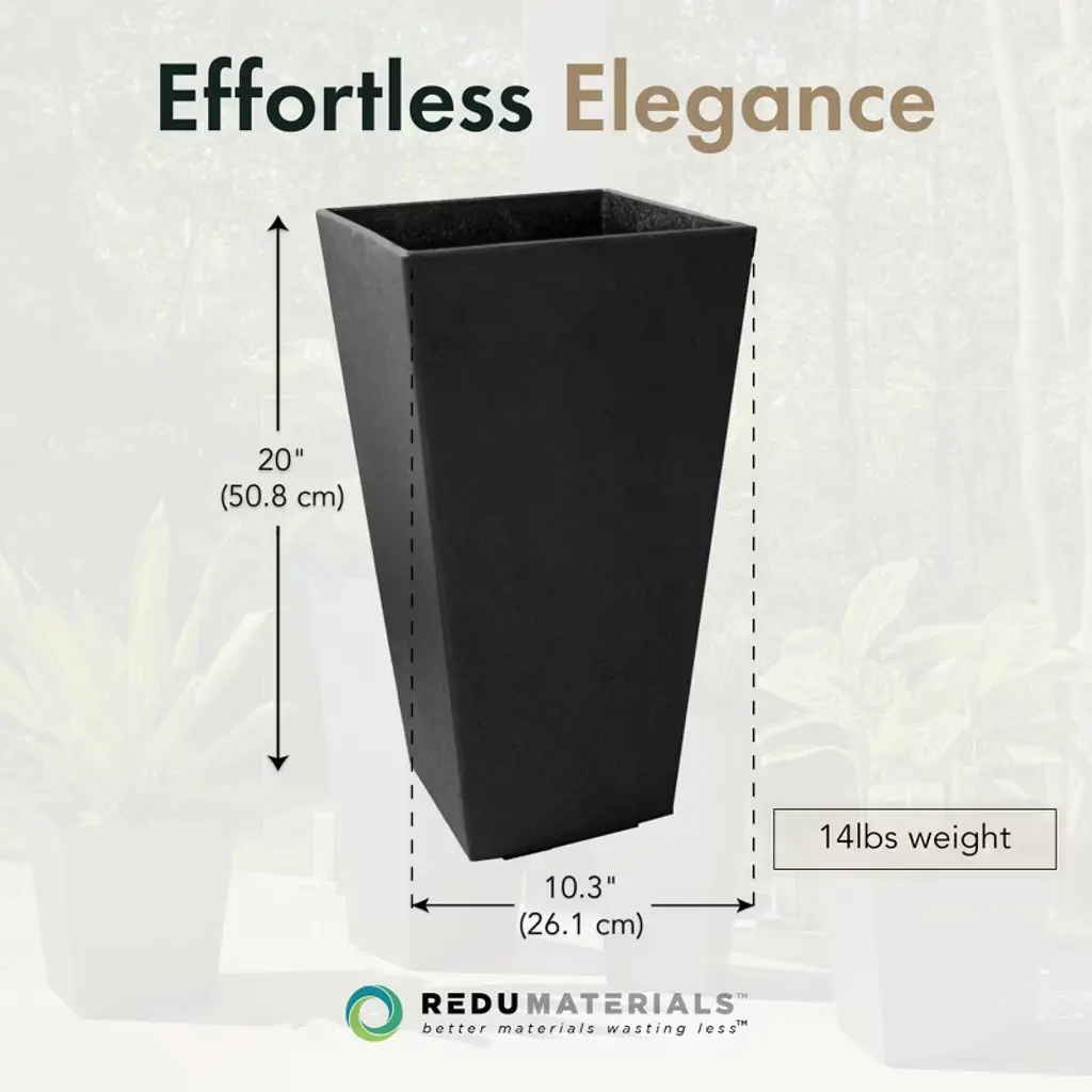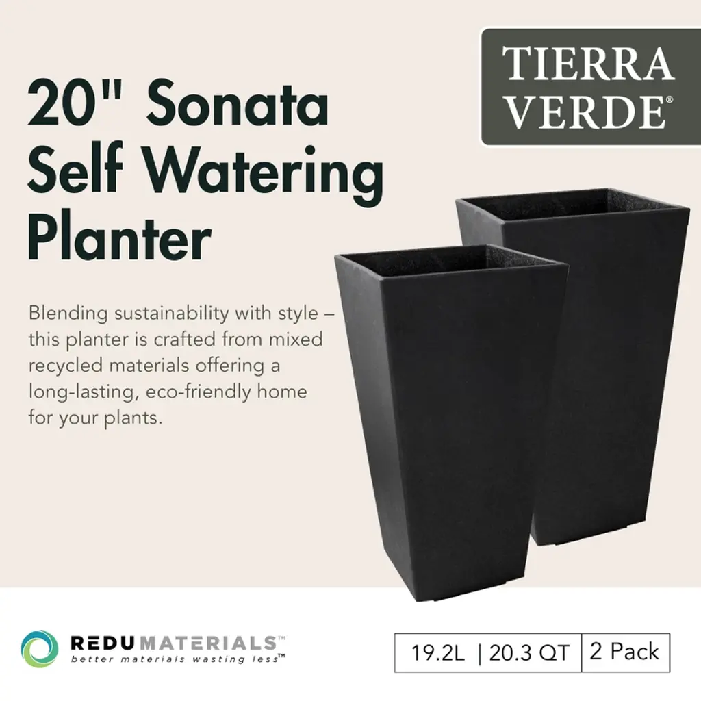 The Tierra Verde 11-inch W x 20-inch H Sonata planter is an elegant and eco-friendly choice for any outdoor living space, patio, or indoor area. Crafted from recycled material, this sleek planter is designed to withstand the elements, offering durability for all seasons. Featuring a raised insert that creates an interior self-watering system, it ensures plants stay hydrated with ease. The water reservoir at the base allows plant roots to stretch down into the water, providing nourishment and promoting healthy growth. When used outside, a plug on the bottom may be removed to drain excess water. Ideal for busy plant owners, especially those who travel, this feature keeps your plants well-maintained with minimal effort. Tierra Verde planters are tested in -40 to +40 degrees Celsius weather, ensuring that it is suitable for year-round use. Perfect for a variety of plants, the Tierra Verde Sonata planter brings both practicality and sophistication to your space. Made locally in North America.