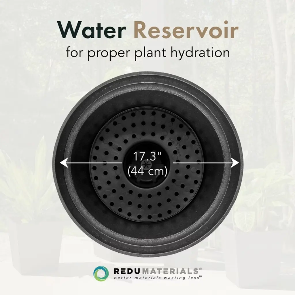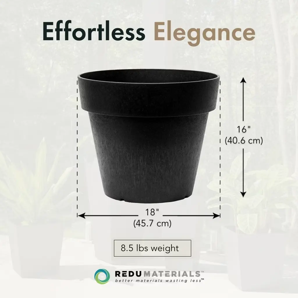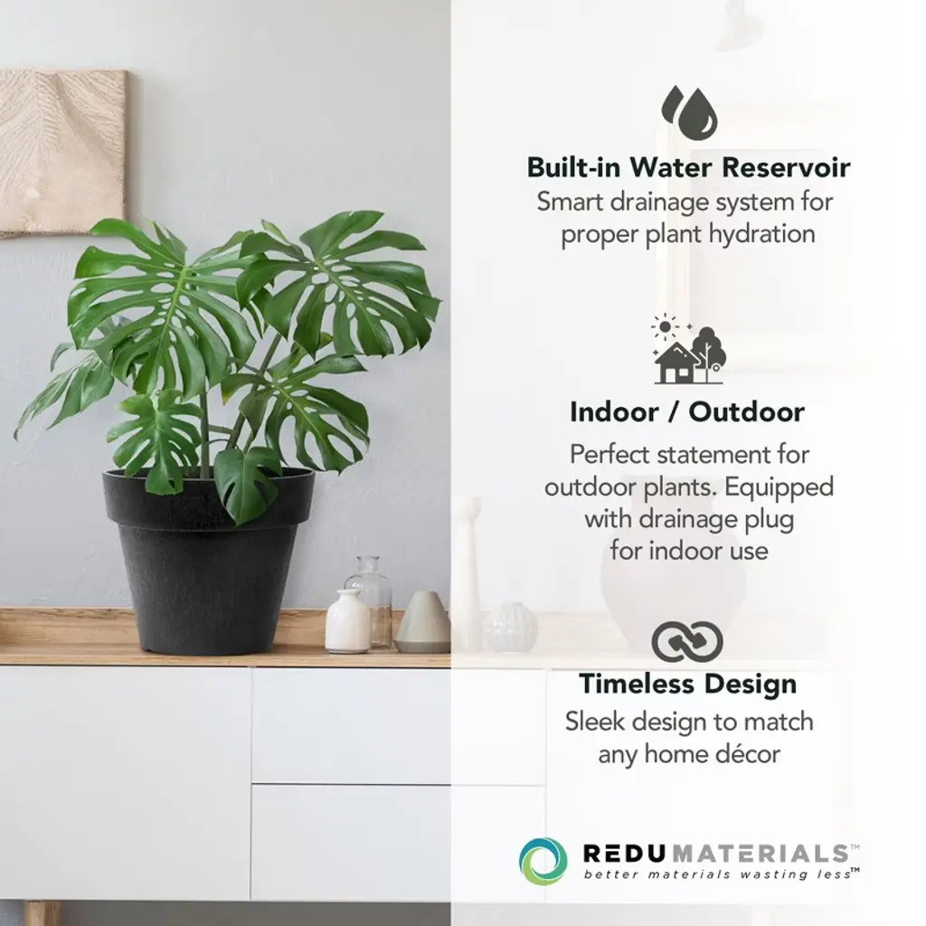 Dress up your entryway, patio, deck, or any outdoor living space with the Tierra Verde Baritone Self Watering Large Round Planter in Black. Crafted from durable, recycled materials, this planter helps you create a lush, green environment while contributing to reducing waste. Its sleek, black finish and straight, tapered profile make it a stylish choice for modern patios, decks, or entryways, blending effortlessly into any decor. Designed for versatility, the planter features an innovative self-watering system that keeps your plants hydrated without daily attention. By storing water in the base, the planter ensures that your plant’s roots can access the water they need, keeping your garden lush and healthy. For outdoor use, remove the drainage plug to avoid overwatering, and enjoy the beauty of this planter season after season. Whether you want to add greenery to your home, patio, or garden, this weatherproof pot is built to last, providing low-maintenance elegance. Its thoughtful construction enhances your space helps you conserve water and keeps your plants healthy and thriving. Add a touch of nature to your space today with the Tierra Verde Baritone Self Watering Large Round Planter in Black, an ideal addition to your indoor or outdoor living space, offering a blend of style, functionality, and sustainability.