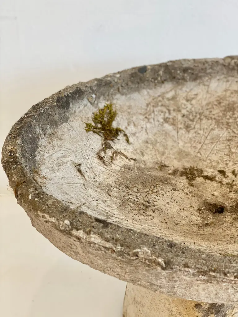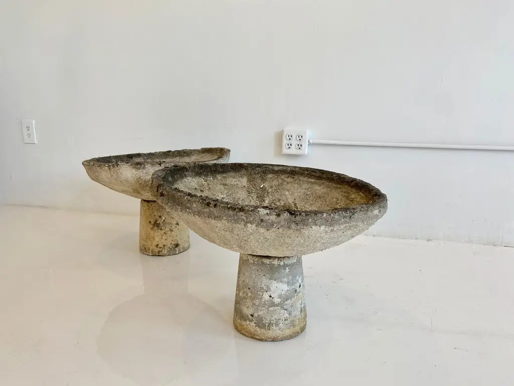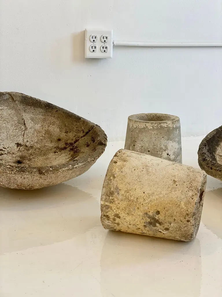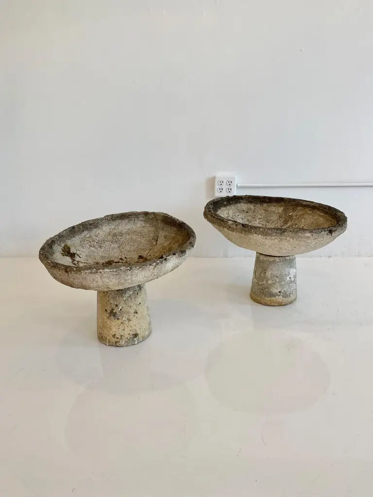French concrete tilted bowl planters with base. Bowl is removable and sits on top of the cylindrical base. All slightly varying patinas. Very sturdy. Look great grouped together as a set. 7 available. Priced individually.