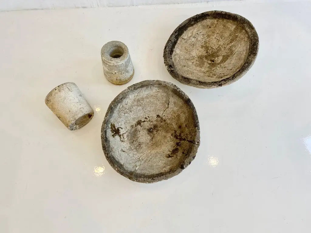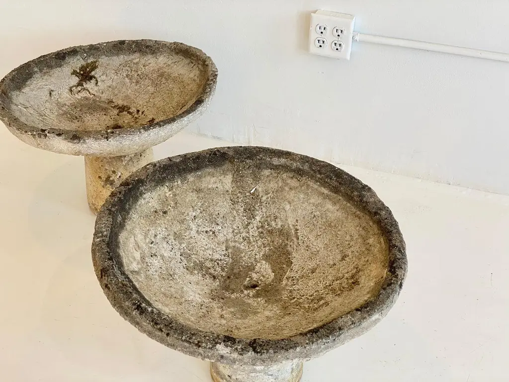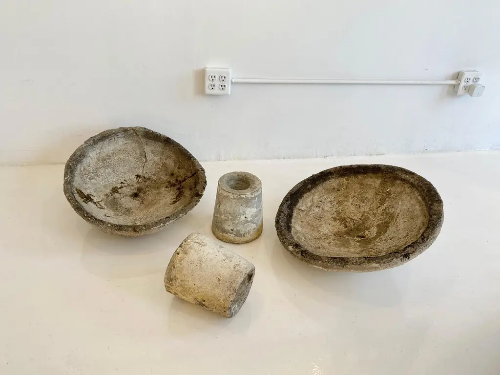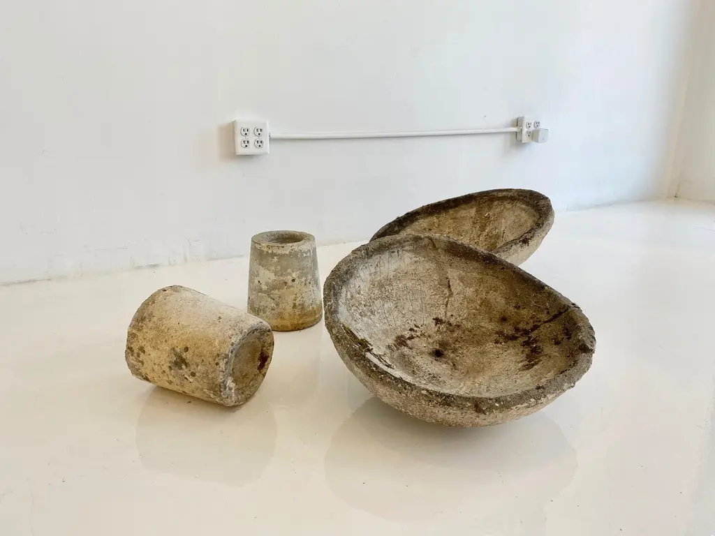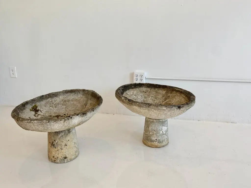 French concrete tilted bowl planters with base. Bowl is removable and sits on top of the cylindrical base. All slightly varying patinas. Very sturdy. Look great grouped together as a set. 7 available. Priced individually.