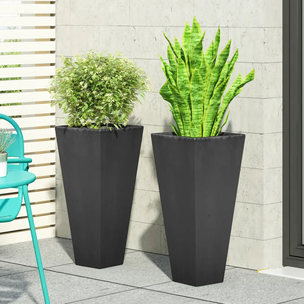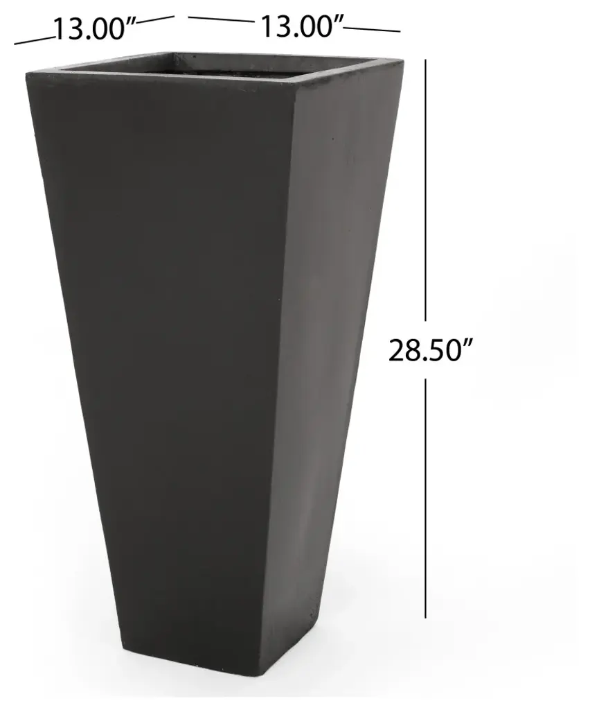 Modernize your outdoor space with a planter that will house your plants with style. From its sleek tapered design to its lightweight concrete structure, our planter set will instantly enhance your patio or backyard space with style. These accessories offer a durable construction to ensure that your plant has a stable home to grow. Complemented with a matte finish, this planter set offers a classic look to your garden or porch. Perfectly crafted to hold your plants, this piece is the perfect accessory for your green thumb.• • A TOUCH OF PERSONALITY: Bring your outdoor area to life with our delightful cast stone planter set. With sleek aesthetics, these accessories will not only enliven your backyard or patio space but also provides space to grow plants.• • TAPERED DESIGN: Each planter features a beautifully tapered shape, giving your outdoor space a stunning accent. This offers a polished look for a modern touch to your home.• • CAST STONE: Constructed with lightweight concrete, this planter set offers a smooth, tapered design that also has a highly durable structure and is resistant to outdoor elements.• • DIMENSIONS: Choose an accessory that is the perfect size for you and your outdoor space. Each planter has dimensions of 13.00" L x 13.00" W x 28.50" H. You will love how much your space can transform with the simple addition of this accessory.• • NO ASSEMBLY: This planter set comes ready to use straight out of the box. No assembly is required. This comes as a set of two.• Includes: Two (2) PlantersMaterial: Lightweight ConcreteFinish: Matte BlackHand-Crafted DetailsNo Assembly RequiredDimensions: 13.00 inches deep x 13.00 inches wide x 28.50 inches high