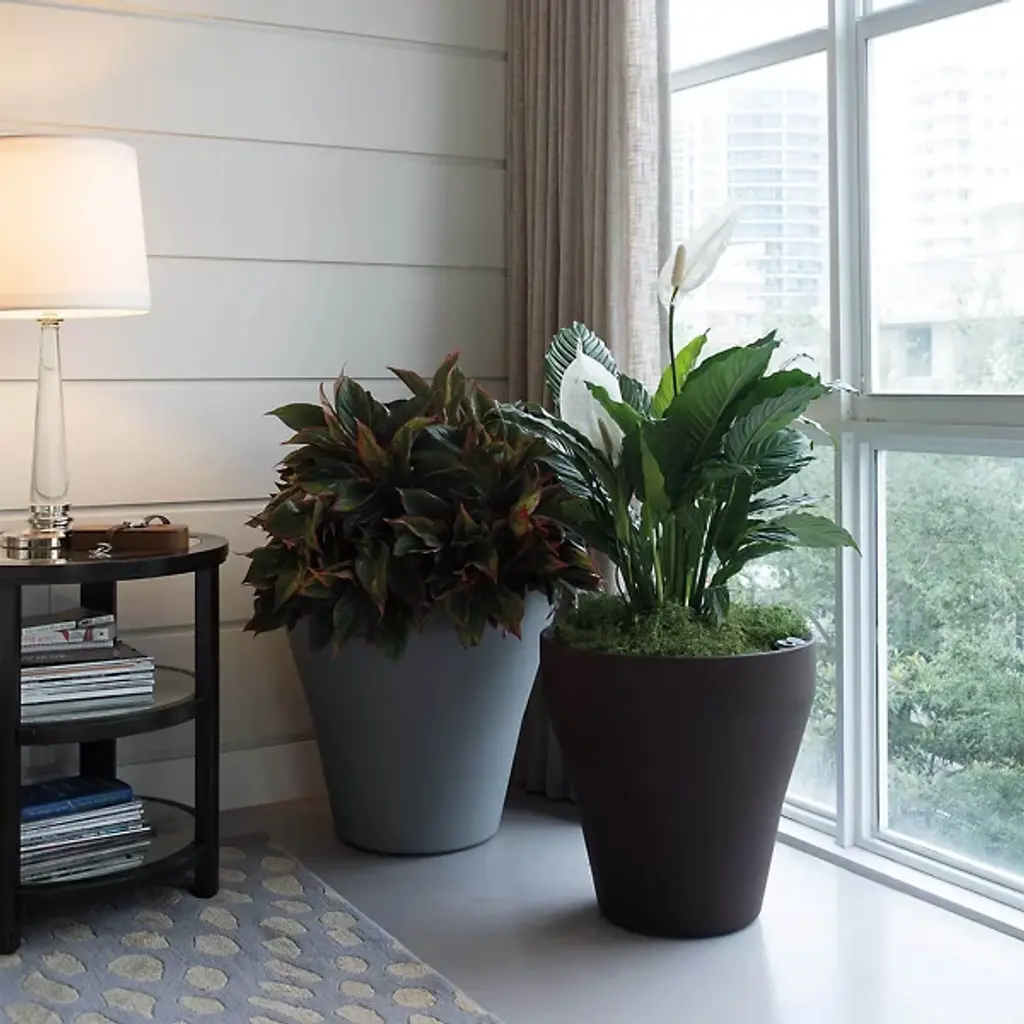 The Crescent Garden TruDrop Self Watering Round Indoor/Outdoor Planter has a tapered shape and range of available colors that will complement any plant or container garden. It is made out of durable and lightweight polymer resin, making it suitable for year round outdoor or indoor use. The Rim Planter includes the TruDrop self-watering system to make watering and caring for your plants even easier.