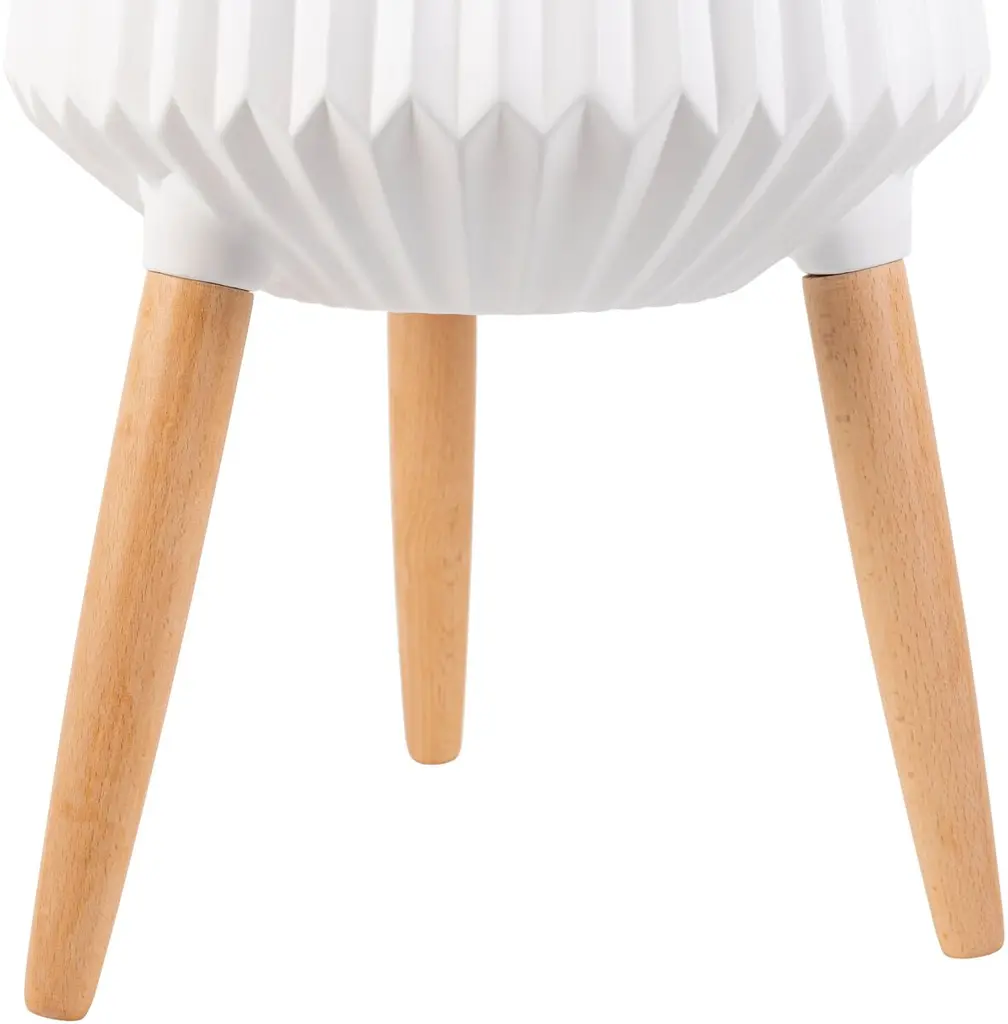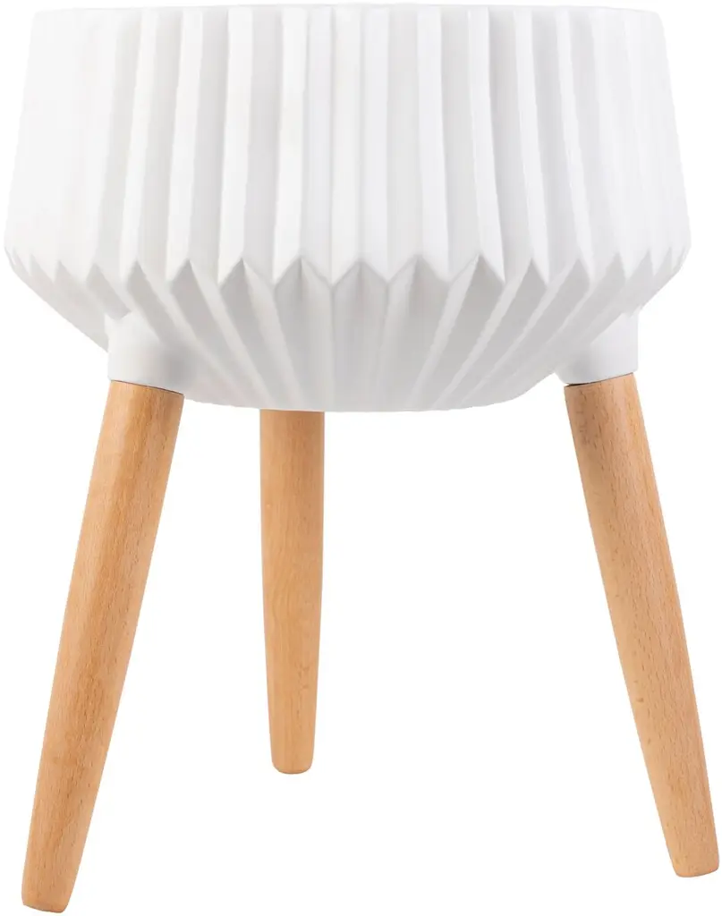 In an inviting juxtaposition of textures and shapes, splayed wood legs support a round white ceramic planter.