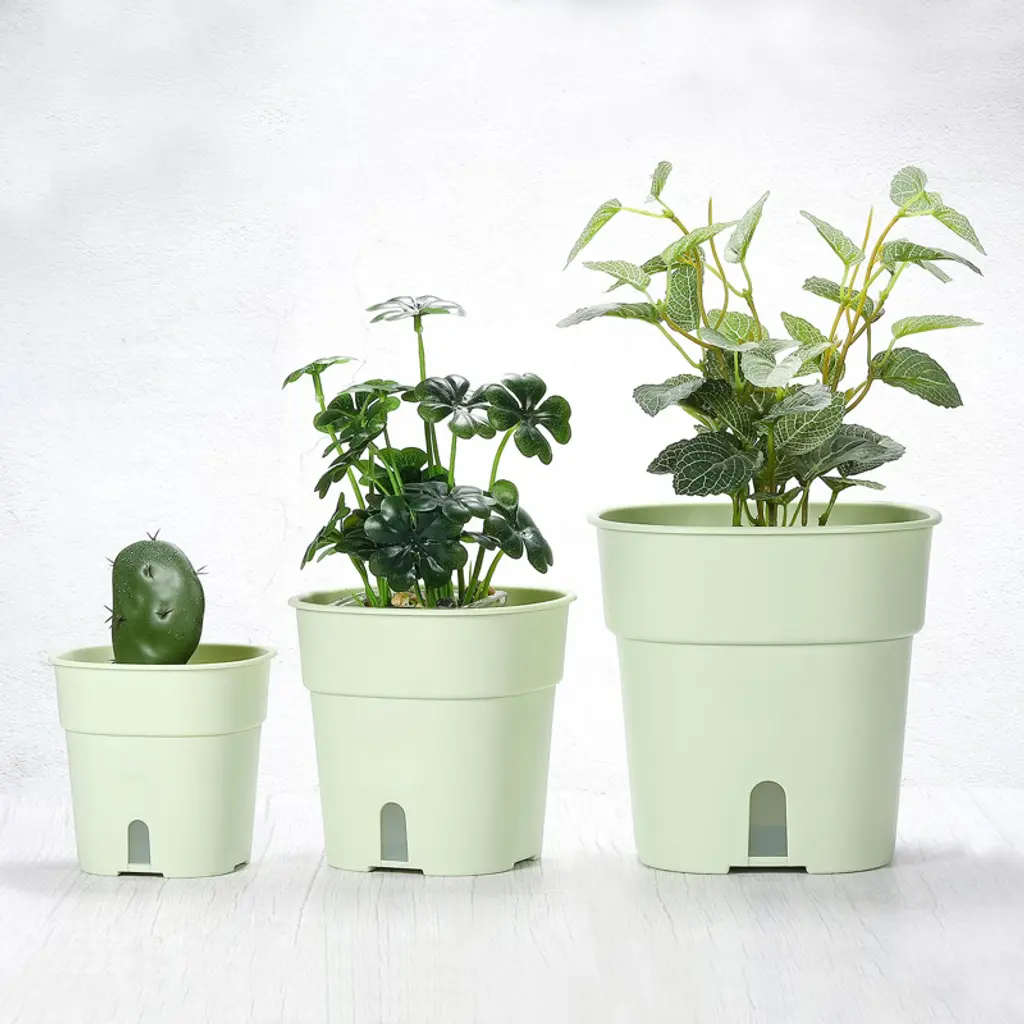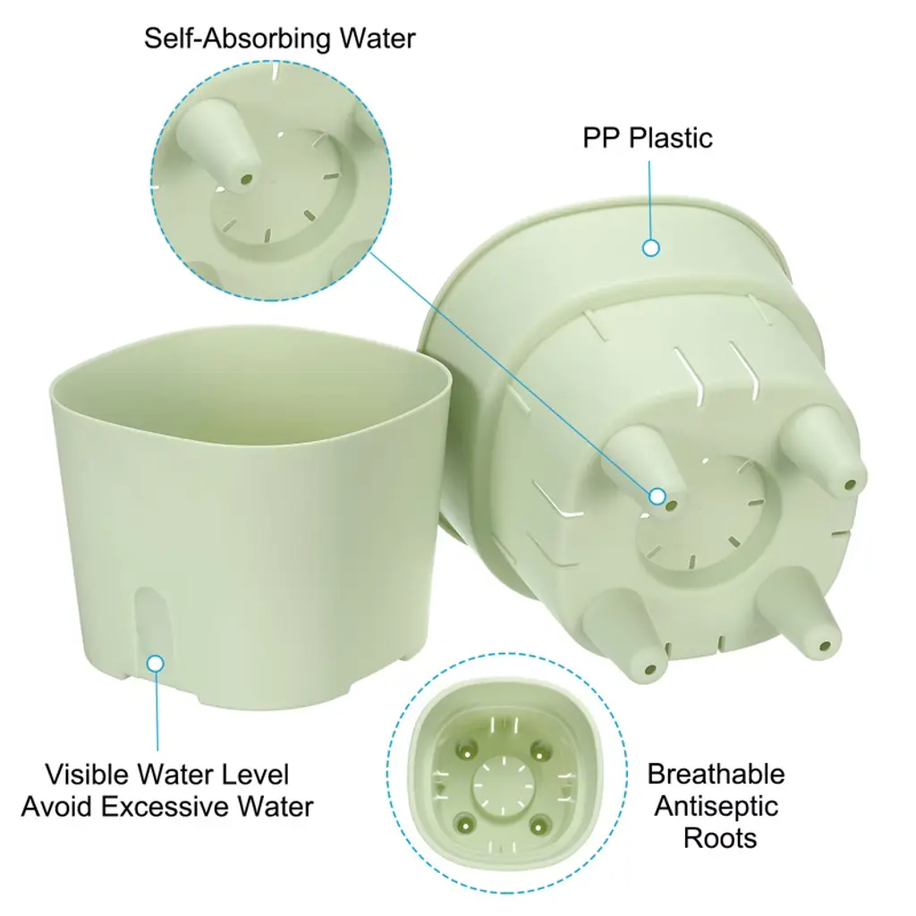 The plant pot is perfect for planting flowers, succulents, and various other small plants. It is suitable for home, room, balcony, patio, garden, and both indoor and outdoor settings. Made from thickened PP plastic material, this planter is lightweight, sturdy, and durable. It has good toughness and does not deform or fade, ensuring a long service life. The bottom of the pot features a drainage structure that allows the roots to breathe freely and prevents excessive water accumulation, promoting root growth. The water reservoir allows for easy monitoring of water levels and enables timely replenishment.