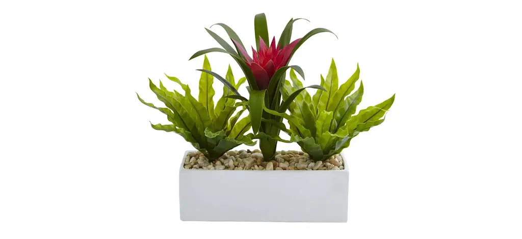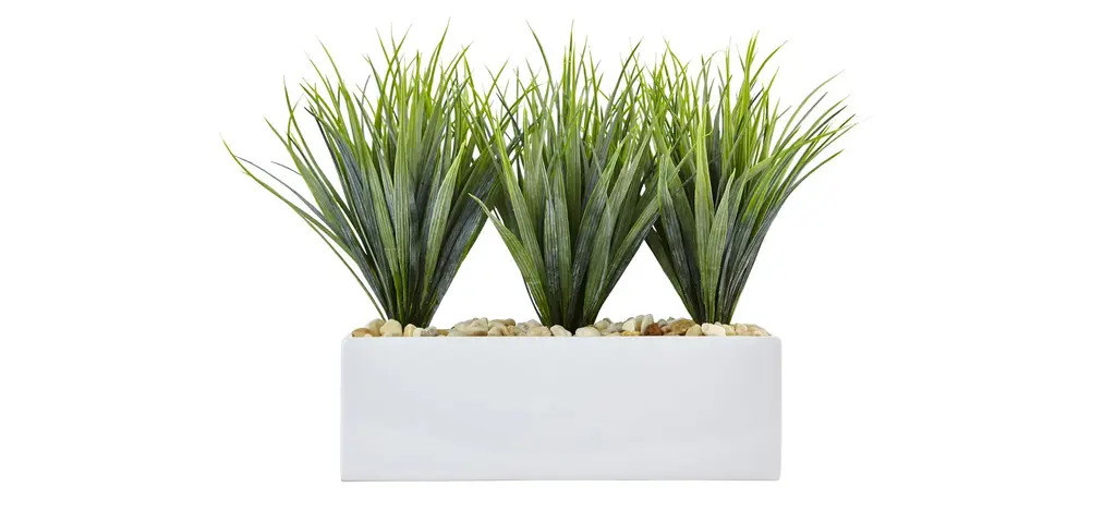 Place the Vanilla Grass in Rectangular Planter in the home office or atop end tables for simple decor in small spaces. Textured Vanilla grass bunches in modern uniform for a simple, yet unique, botanical arrangement. Realistic shades of green coat the textured rubber blades for a realistic touch and appearance.