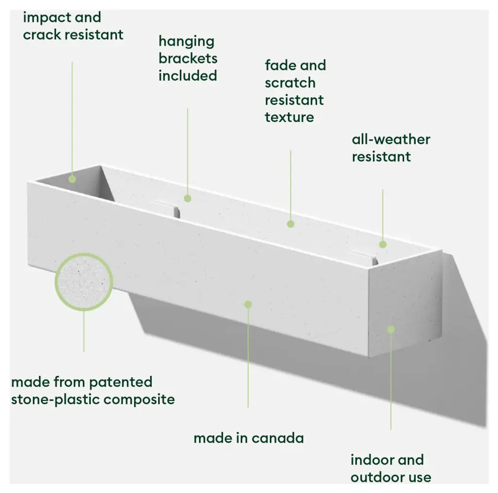Clean lines and minimalist design make the Veradek Geo Hanging Short Planter an effective option for adding a bit of greenery to walls indoor or out. Complemented by its modern appearance, the Geo Hanging Short is thoughtfully curated with functionality in mind"”easily mount your planter and start growing herbs, succulents or flowers with all the necessary hardware included. This lightweight rectangular planter is proudly crafted in Canada from a patented plastic-stone composite, making it resistant to cracks, fading and UV and easy to clean. With the perfect balance of design, structure and purpose, the Geo Hanging Short is a must-have for bringing aesthetic appeal while maximizing space efficiency.