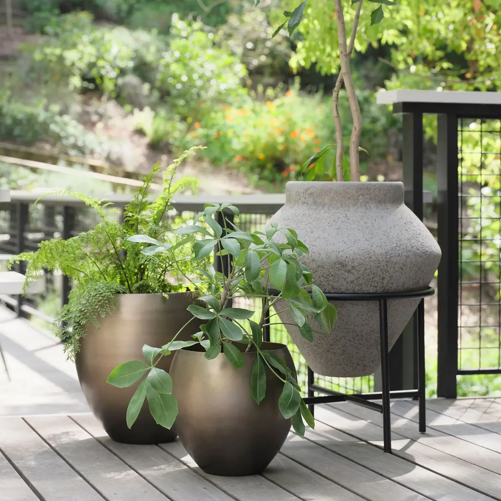 Drainage holes help protect sensitive roots. Frost-proof material can be used outdoors. Made from an easy-to-move lightweight composite. The planters can be removed from their stand for more display options.