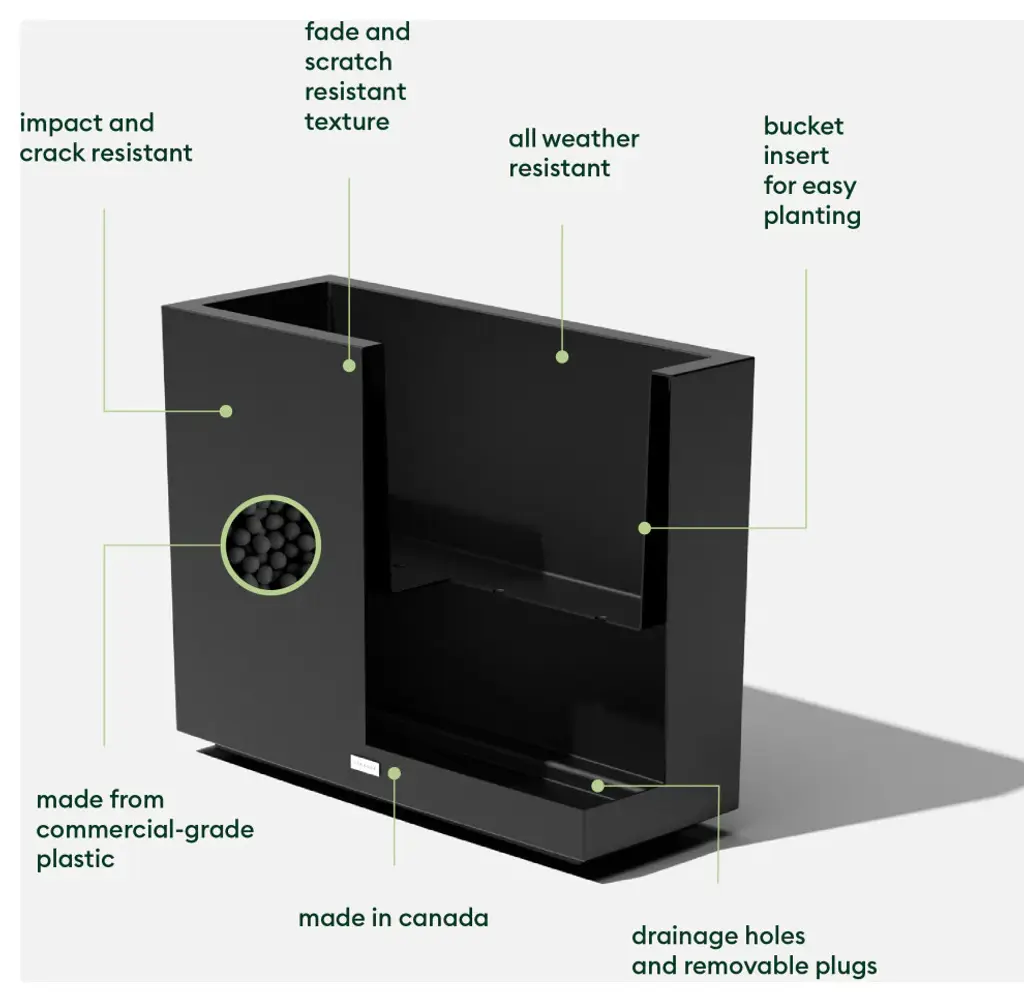 The wide-bodied design makes the Veradek Span Planter the optimal solution for creating privacy or defined spaces in the backyard or patio. Easily switch out tall plants, flowers or shrubs and prevent overwatering with the removable insert bucket and pre-drilled drainage holes. This sturdy yet lightweight rectangular planter is proudly crafted in Canada from high-grade recycled plastic, making it resistant to cracks, fading and UV and allowing it to withstand extreme temperatures ranging from -20 to +120 degrees. With the ideal balance of design, structure and purpose, the Span planter box pairs perfectly indoor or outdoor with any arrangement, any season.