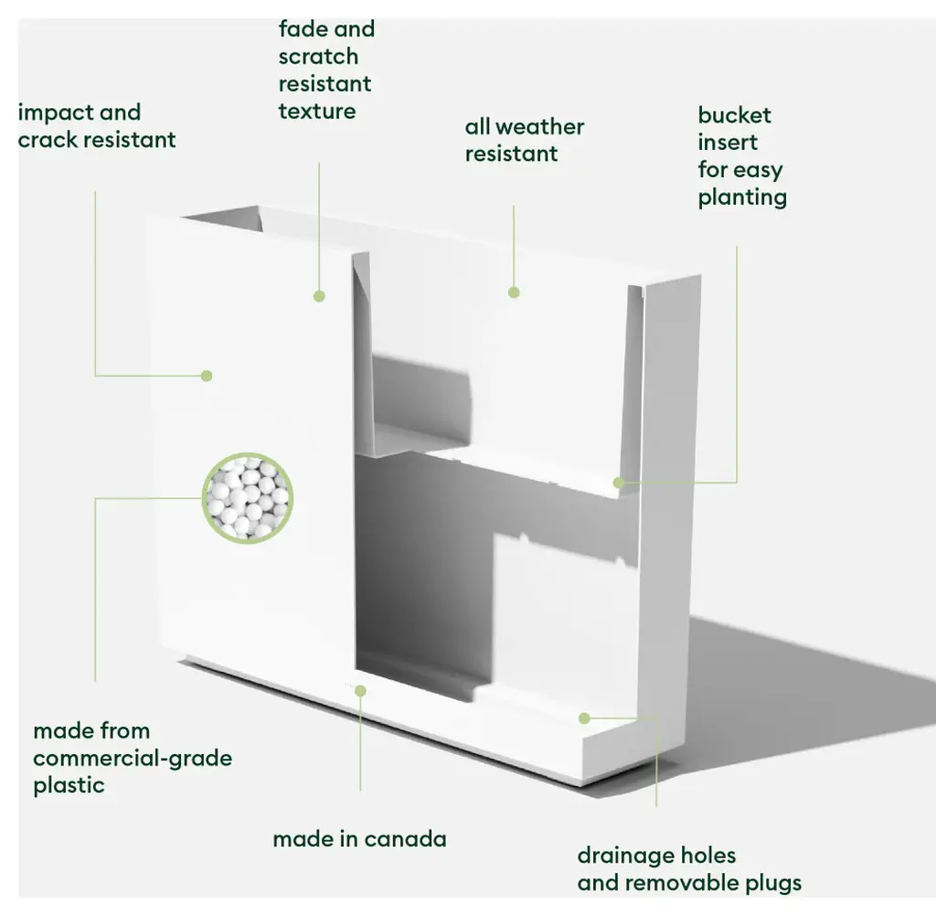 The wide-bodied design makes the Veradek Span Planter the optimal solution for creating privacy or defined spaces in the backyard or patio. Easily switch out tall plants, flowers or shrubs and prevent overwatering with the removable insert bucket and pre-drilled drainage holes. This sturdy yet lightweight rectangular planter is proudly crafted in Canada from high-grade recycled plastic, making it resistant to cracks, fading and UV and allowing it to withstand extreme temperatures ranging from -20 to +120 degrees. With the ideal balance of design, structure and purpose, the Span planter box pairs perfectly indoor or outdoor with any arrangement, any season.