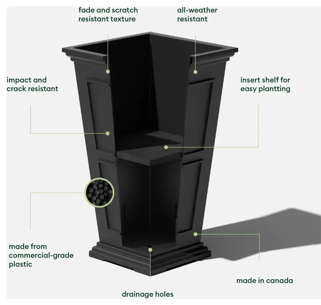 Old meets new. Taking inspiration from lush estate gardens, the Veradek Brixton Tall Planter combines traditional design with modern technology making it best suited for the front porch or patio. Featuring a removable insert bucket, the Brixton Tall makes it easy to switch out plants, flowers or shrubs and pre-drilled drainage holes help prevent overwatering. This sturdy yet lightweight planter is proudly crafted in Canada from high-grade recycled plastic, making it resistant to cracks, fading and UV and allowing it to withstand extreme temperatures ranging from -20 to +120 degrees. With the perfect balance of design, structure and purpose, the Brixton Tall pairs perfectly with any indoor or outdoor arrangement to make a grand statement.