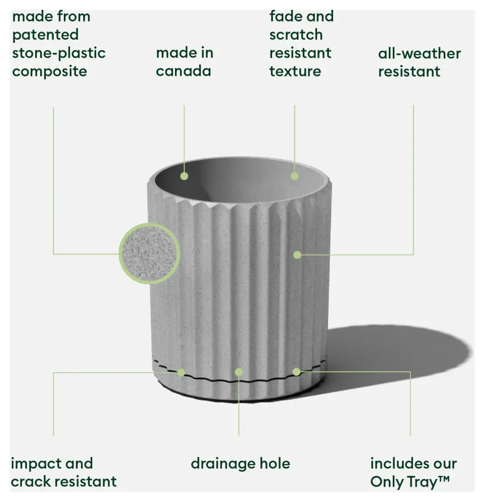 Inspired by traditional Roman columns, the fluted edges on the Veradek Demi Planter help to create a cozy indoor or outdoor space in the living room, patio or backyard. Pre-drilled drainage holes allow for planting a variety of different greenery such as trees, tall plants or flowers without having to worry about overwatering. This sturdy yet lightweight round planter is proudly crafted in Canada from a patented plastic-stone composite, making it resistant to cracks, fading and UV and allowing it to withstand extreme temperatures ranging from -20 to +120 degrees. With the ideal balance of design, structure and purpose, the Demi will add the finishing touches needed to transform a house into a home.